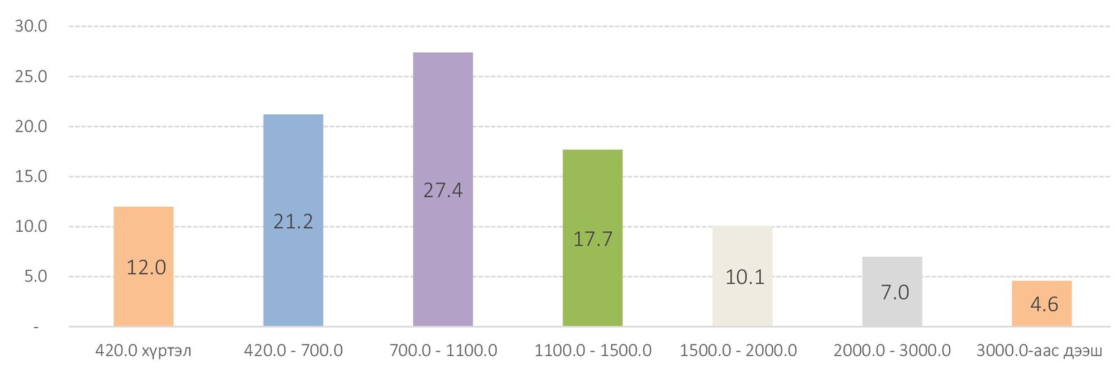 Нийгмийн даатгалын шимтгэл төлөлтийн тайланд хамрагдсан ажиллагчдын цалингийн хэмжээг харвал 12% нь 420,000 төгрөг хүртэлх цалинтай байгаа бол 4.6% нь 3 сая төгрөгөөс дээш цалинтай байна.