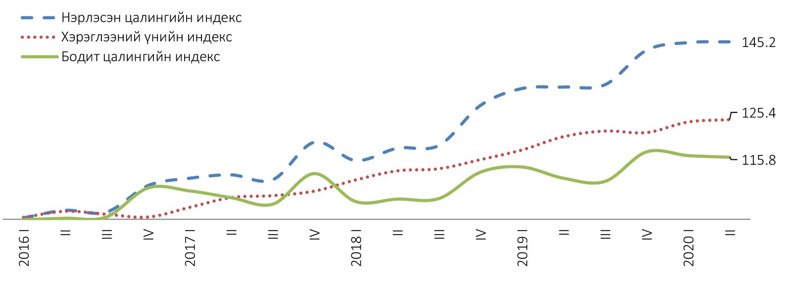 Ажиллагчдын сарын дундаж нэрлэсэн цалин 2020 оны II улиралд 2015 оны IV улирлаас 1.5 дахин буюу 150% нэмэгдсэн хэдий ч худалдан авах чадварыг илэрхийлэх бодит цалин 15.8 хувиар нэмэгджээ.