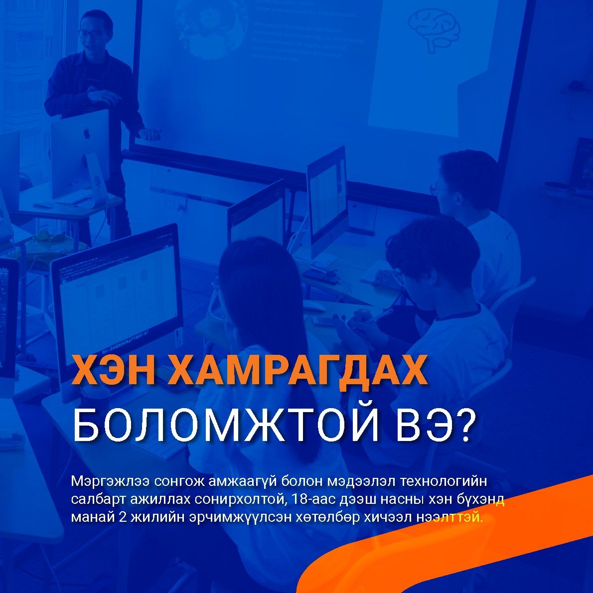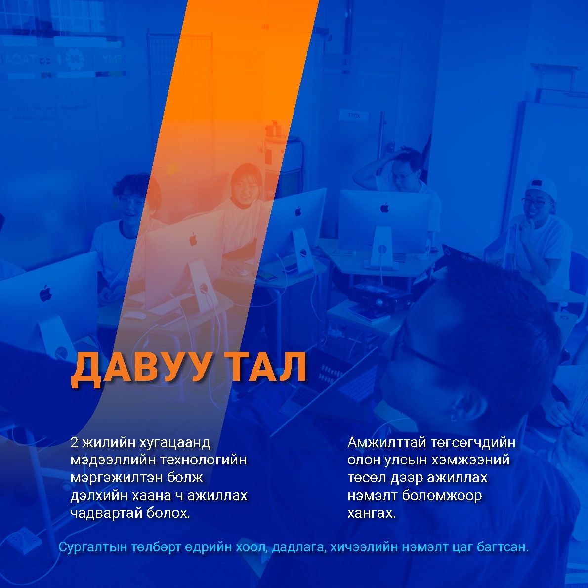 Мэдээллийн технологийн салбарт сонирхолтой, дэлхийд үнэлэгдэх Монголын нэг түмэн инженерийн нэг хэсэг болохыг хүссэн хэн бүхэнд бидний үүд хаалга нээлттэй.