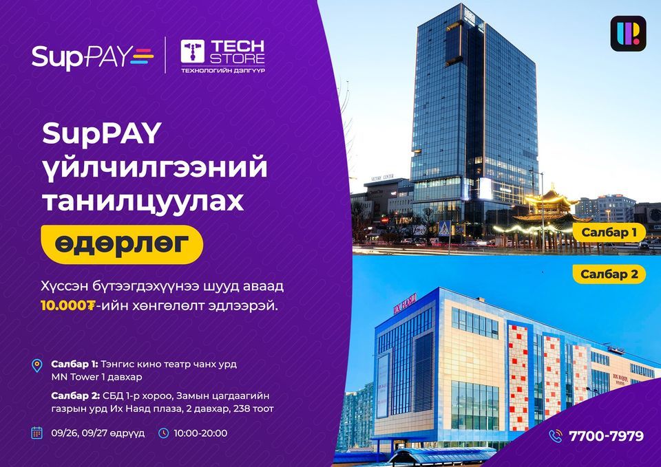 Мөн өдөрлөг дээрээс SupPAY үйлчилгээгээр худалдан авалт хийсэн хэрэглэгч бүрдээ үнийн дүнгээс нь хөнгөлөлт үзүүлж бэлэг барихыг дуулгаж байна. Технологийн дэвшлийг өөрийн биеэр туршиж үзэх энэхүү боломжийг битгий алдаарай.