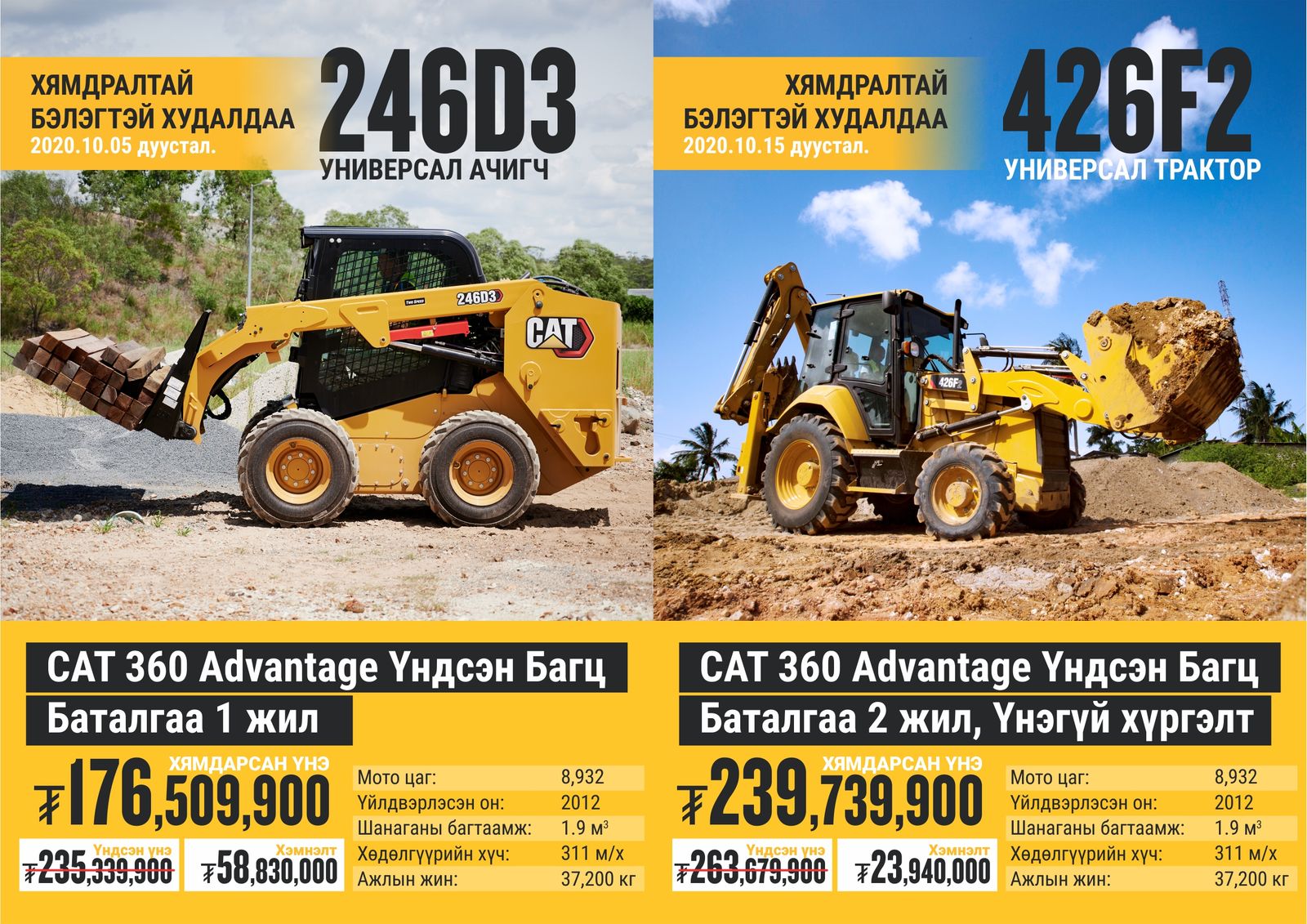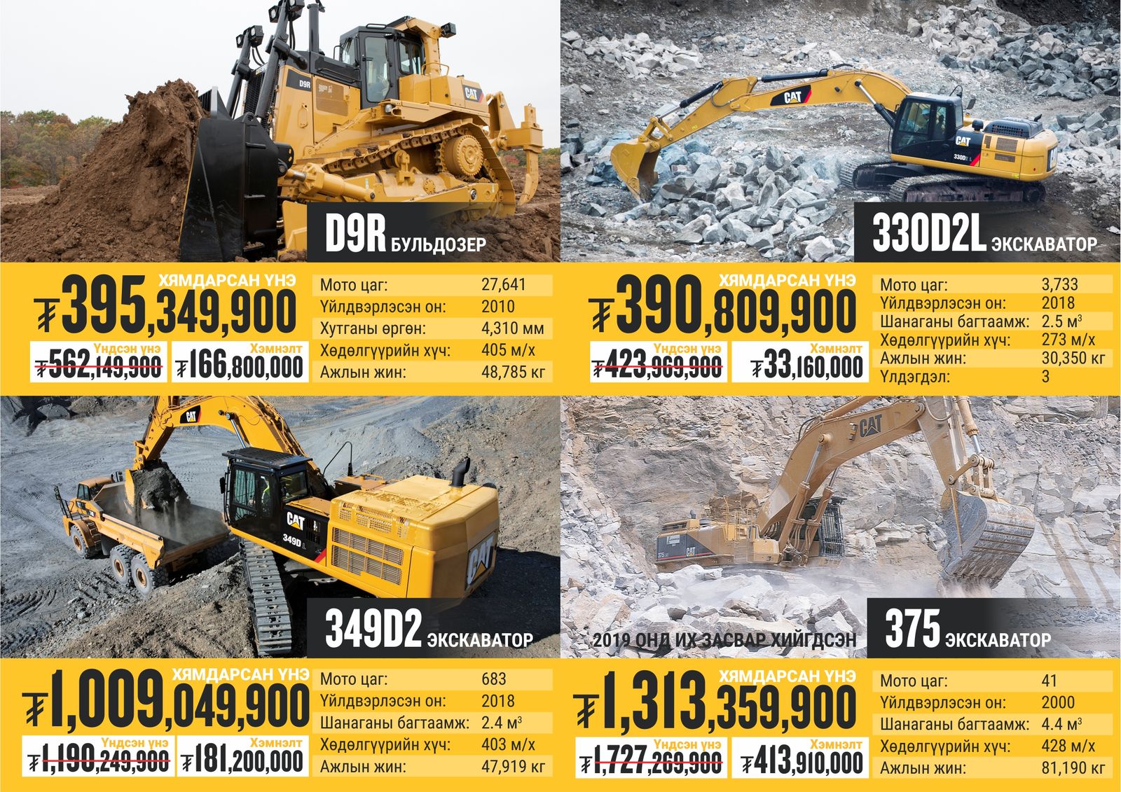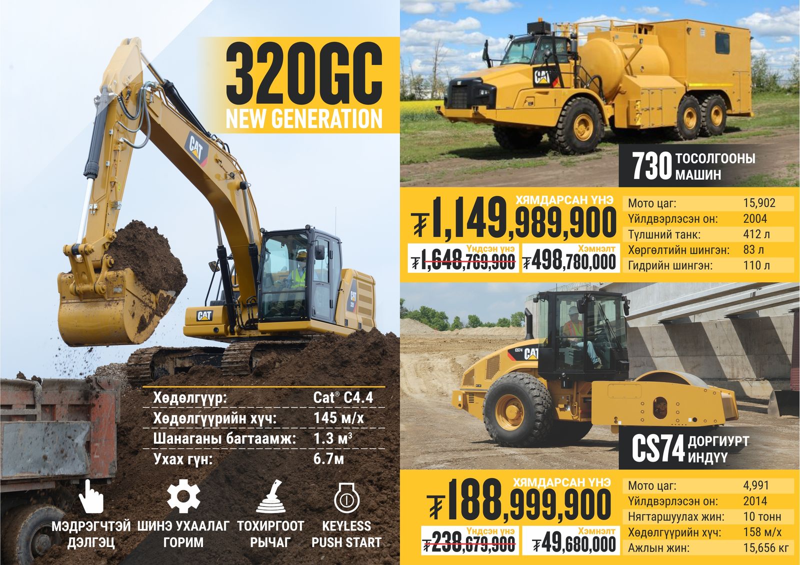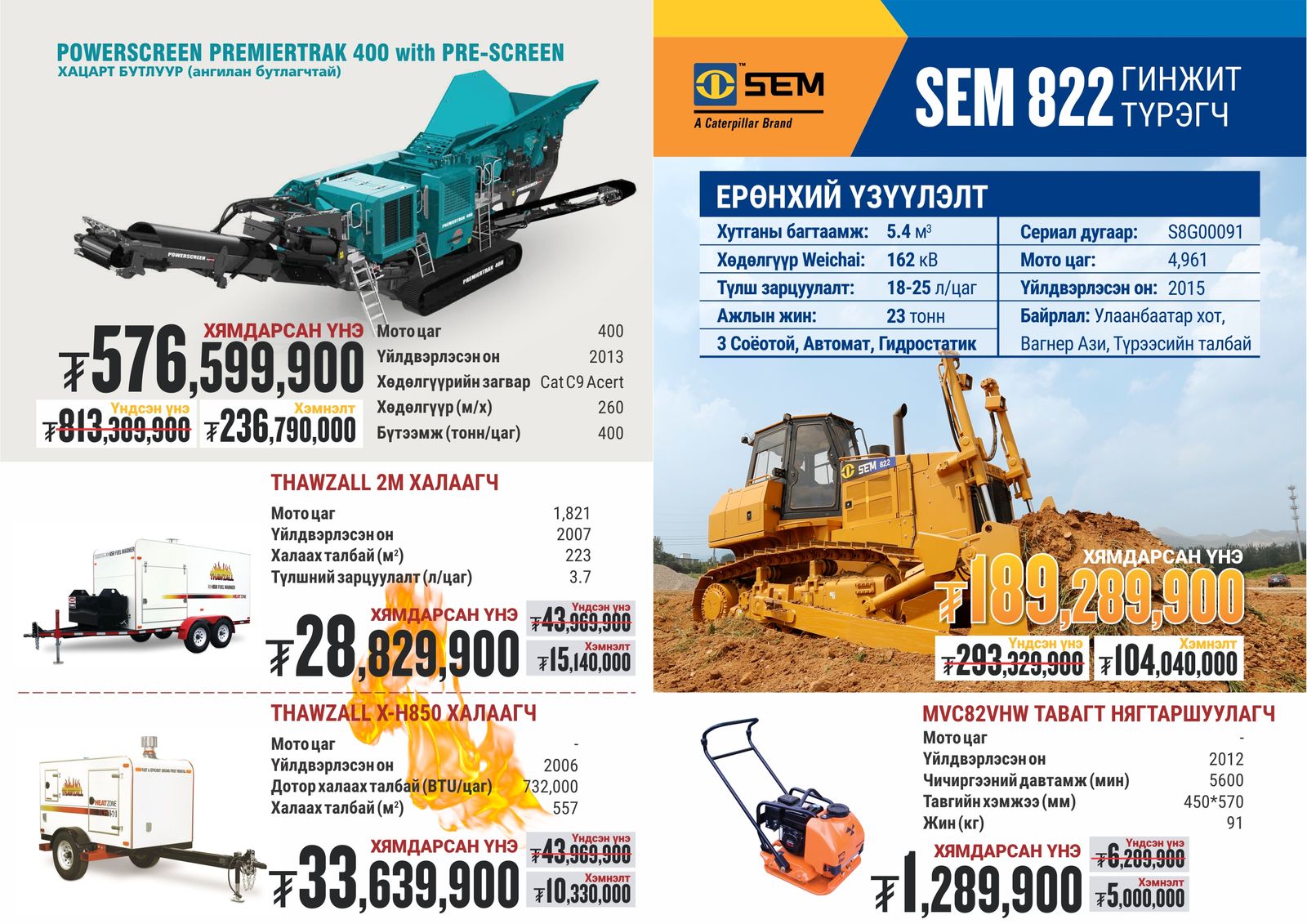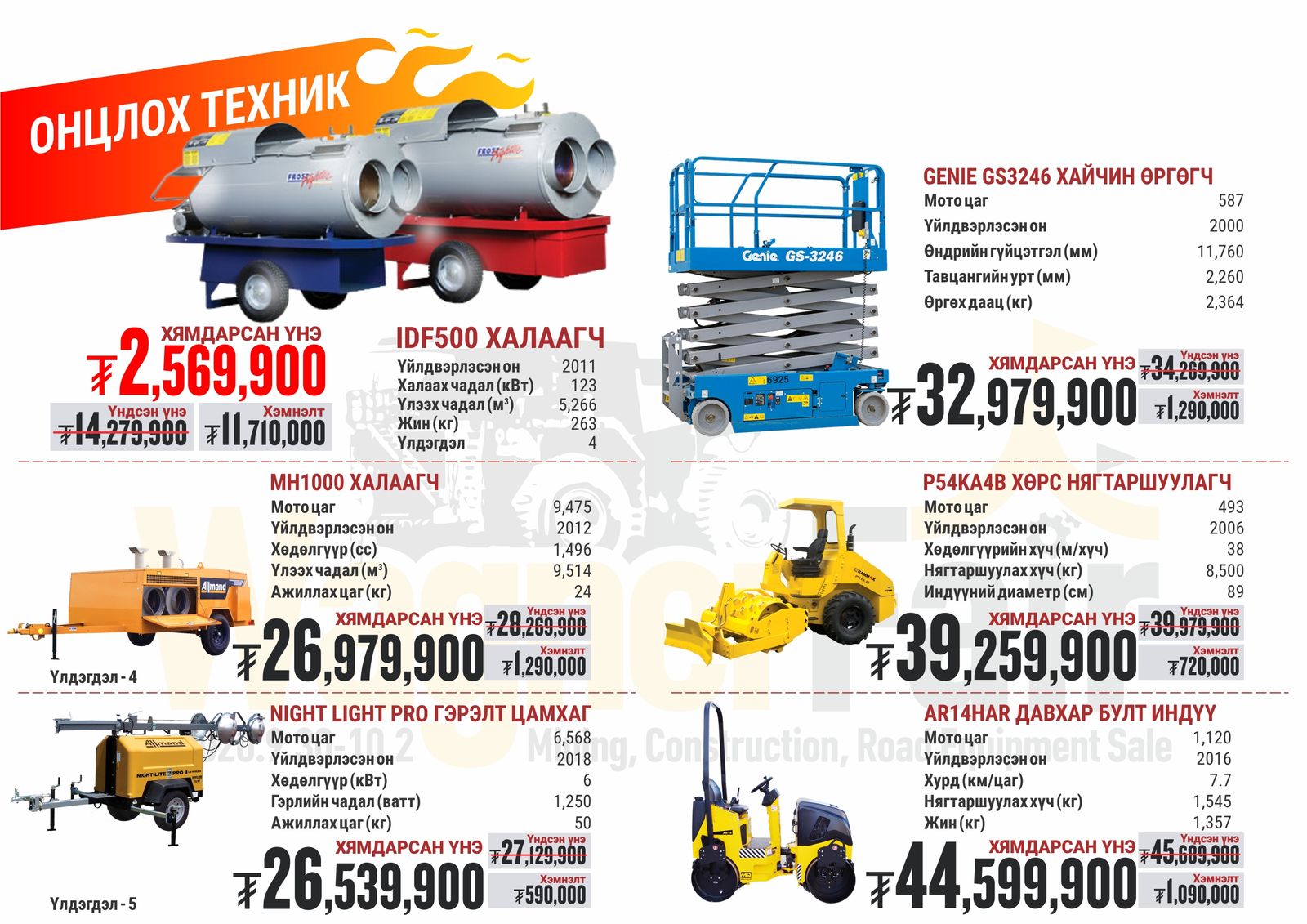 Оролцох брэндүүд: Cat, SEM, Michelin, Genie, Allmand болон бусад төрлийн брэндүүд хамрагдаж байна. Тус урамшууллын хүрээнд экскаватор, бульдозер, цахилгаан үүсгүүр, халаагуур, универсал трактор, олон үйлдэлт ачигч, дугуйт ачигч, ковш, өргөгч, хүнд даацын дугуй, технологийн шийдлүүд, газар тариалангийн бүтээгдэхүүн гм төрөл бүрийн барааг онцгой үнээр авах ховорхон боломжийг бүү алдаарай.