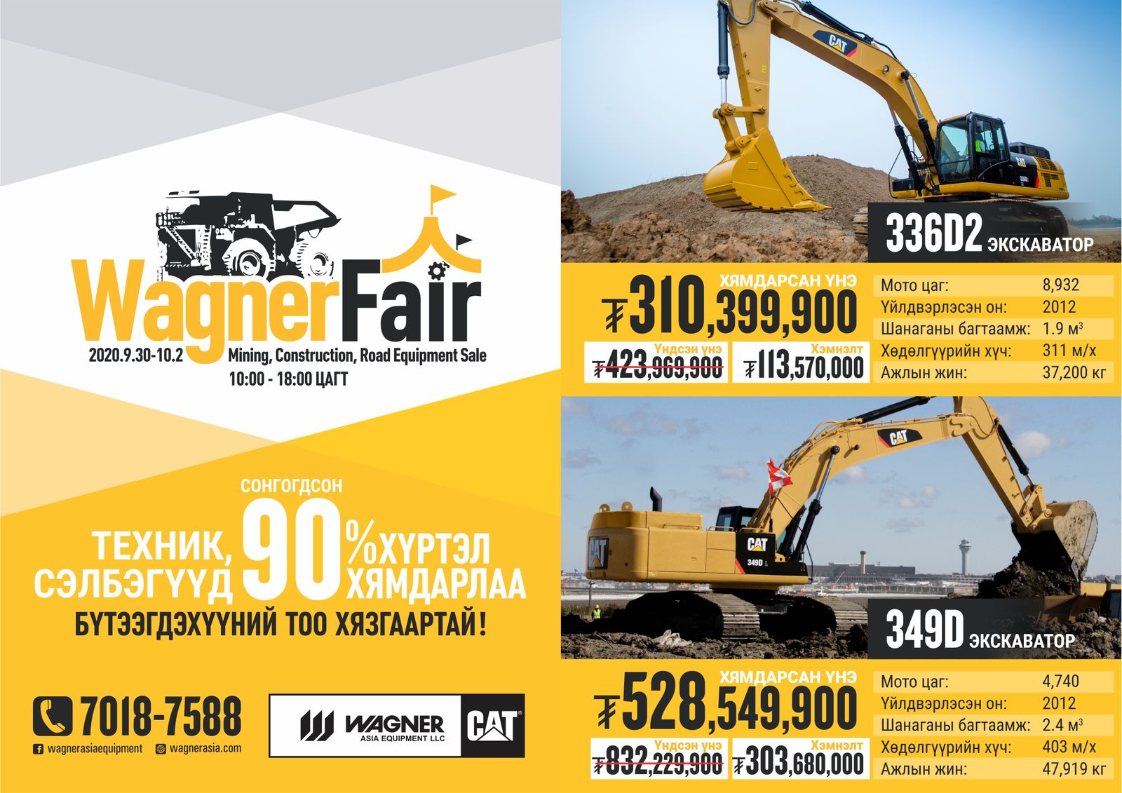 Бүх төрлийн уул уурхай, зам, барилгын шинэ, хуучин машин, тоног төхөөрөмж, сэлбэгийн супер хямдрал, урамшуулалттай үзэсгэлэн худалдаа Вагнер Ази Тоног Төхөөрөмж компаний төв байранд 9 сарын 30, 10 сарын 1, 2-ний өдрүүдэд ердөө 3 өдрийн турш зохион байгуулагдах гэж байна.