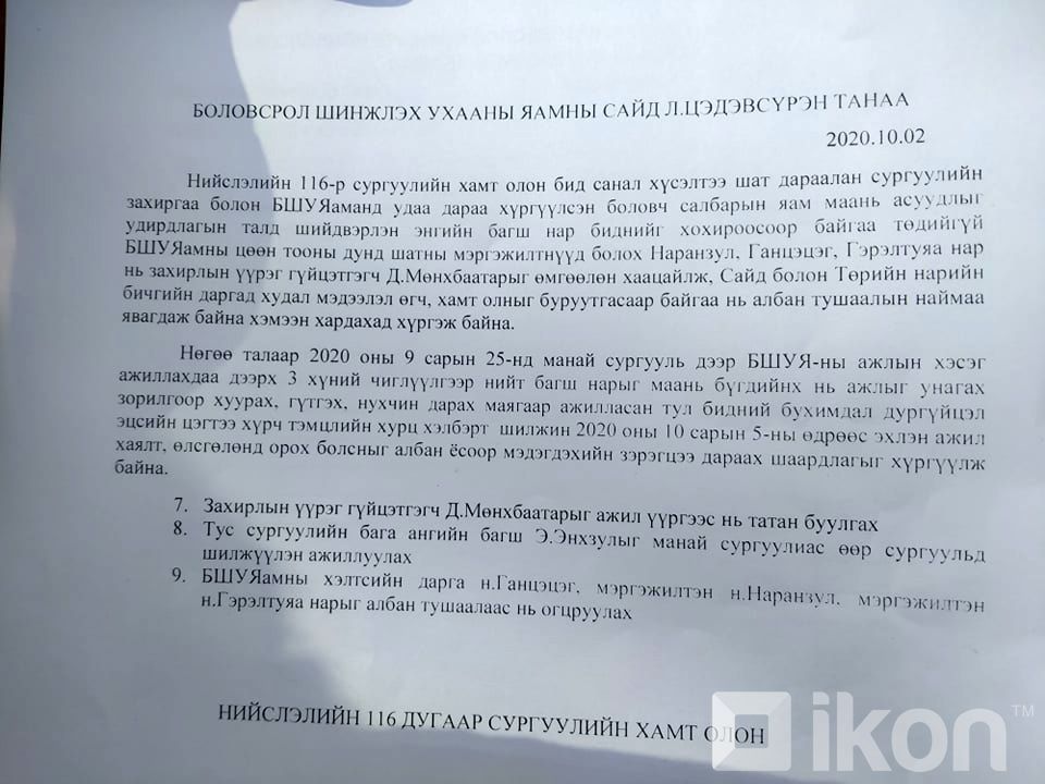 "Яам манай 28 багшийг ур чадваргүй гэж хэвлэлээр гүтгэснийг бид эрс эсэргүүцэж байгаа. Наймдугаар сараас хойш бид үүрэг гүйцэтгэгч томилдог асуудлаа шийдэж өгөөч ээ гэж хандсаар байсан. Одоо болтол ямар ч ахиц дэвшил алга. Бид зүгээр л ажлаа хиймээр байна. Сургуулийг маань ус, цахилгаангүй, дотуур байрыг хүнсгүй болгоод байна.