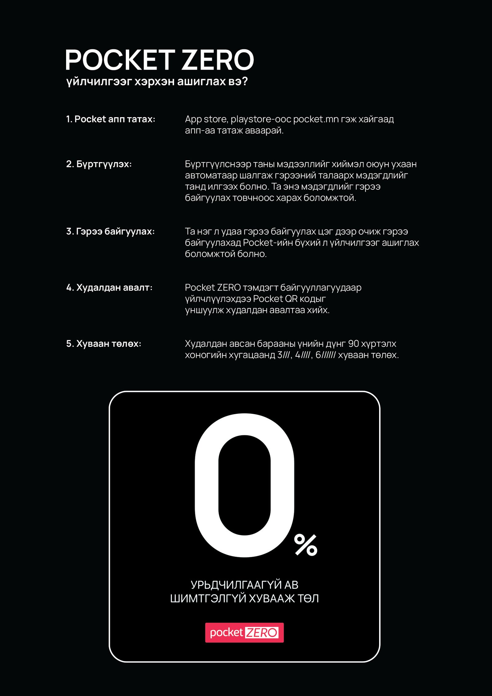 Харилцагчдадаа үргэлж шинэ шинэлэг, илүү урамшуулалтай үйлчилгээнүүдийг санал болгосоор ирсэн Pocket аппликейшн шинэ цагийн төлбөрийн хэрэгсэл болох Pocket ZERO үйлчилгээг зах зээлд нэвтрүүллээ. Ухаалаг утас ашиглагч та Pocket ZERO гэсэн тэмдэглэгээ бүхий байгууллагуудаас худалдан авалт хийхдээ Pocket аппликейшнээ ашиглаад ямар ч урьдчилгаа төлөлгүй хүссэн бүтээгдэхүүн үйлчилгээгээ худалдан аваад, 30-90 хоногийн хугацаанд 2-оос 6 хуваан төлөх боломжтой юм. Үүнээс гадна ямар нэг нэмэлт төлбөргүй буюу шимтгэл 0%, хүү 0% гэдгээрээ онцлог.