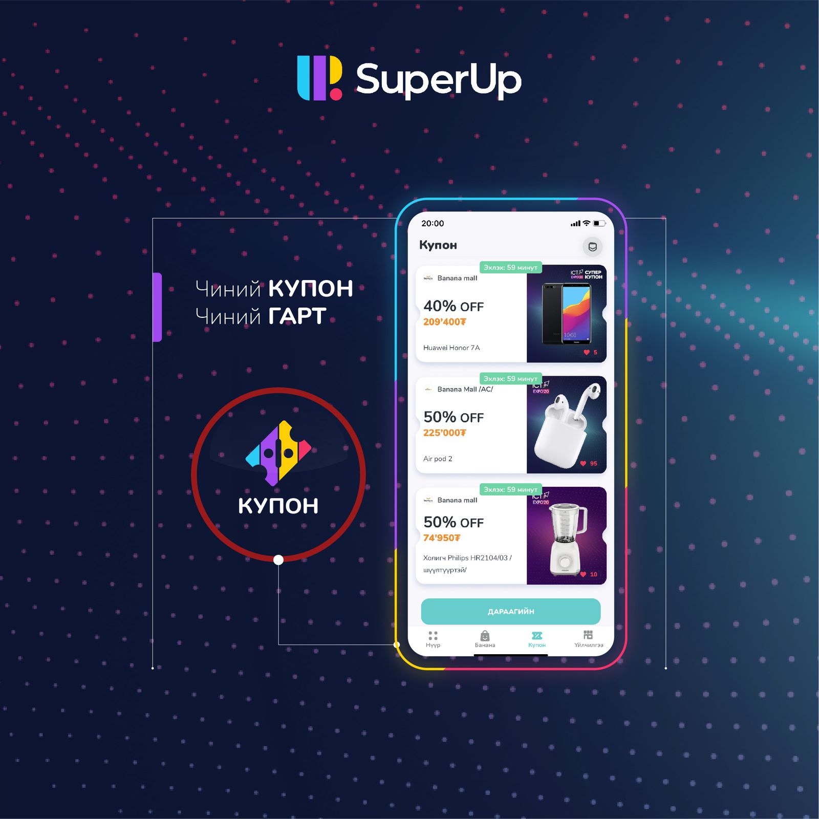 SuperUp аппликейшний зүгээс хэрэглэгчдэд шинэ хэв маяг бий болгож буй үйлчилгээ бол Купон цэс. Хамтрагч байгууллагуудын хамгийн сонирхолтой, хамгийн хэрэгцээт, эрэлттэй аяллын, чөлөөт цаг, эрүүл мэнд, гоо сайхны, хувцас загвар гээд бараг бүх төрлийн бүтээгдэхүүн үйлчилгээг эндээс 20-90%-ийн санаанд оромгүй хөнгөлөлттэй үнээр худалдан авч, бодит хэмнэлтийг хийх боломжтой. Мэдээж хамтрагч байгууллага талдаа ч тун өгөөжтэй гэдгийг хэлэх хэрэгтэй. Өнгөрөгч 5 сард гэхэд л тэд бүх купоноо 100₮ болгож хэрэглэгчдийг алмайруулсан бөгөөд 100,000 гаруй хэрэглэгч нэг зэрэг апп-д нэвтэрч тухайн байгууллагуудын сурталчилгааг шууд хүргэж байсан нь маркетингийн шинэлэг хэлбэр болсон билээ. Энэ жилийн ICT-Expo 2020-д зориулж мөн л гайхалтай сюрпризийг хэрэглэгчдэдээ барьсаар байгаа бөгөөд та яг одоо тус аппликейшний Купон цэс рүү ороод ICT-Expo 2020-д зориулсан онцгой купоныг авч, хаана ч байх хэмнэлтийг мэдрээрэй.