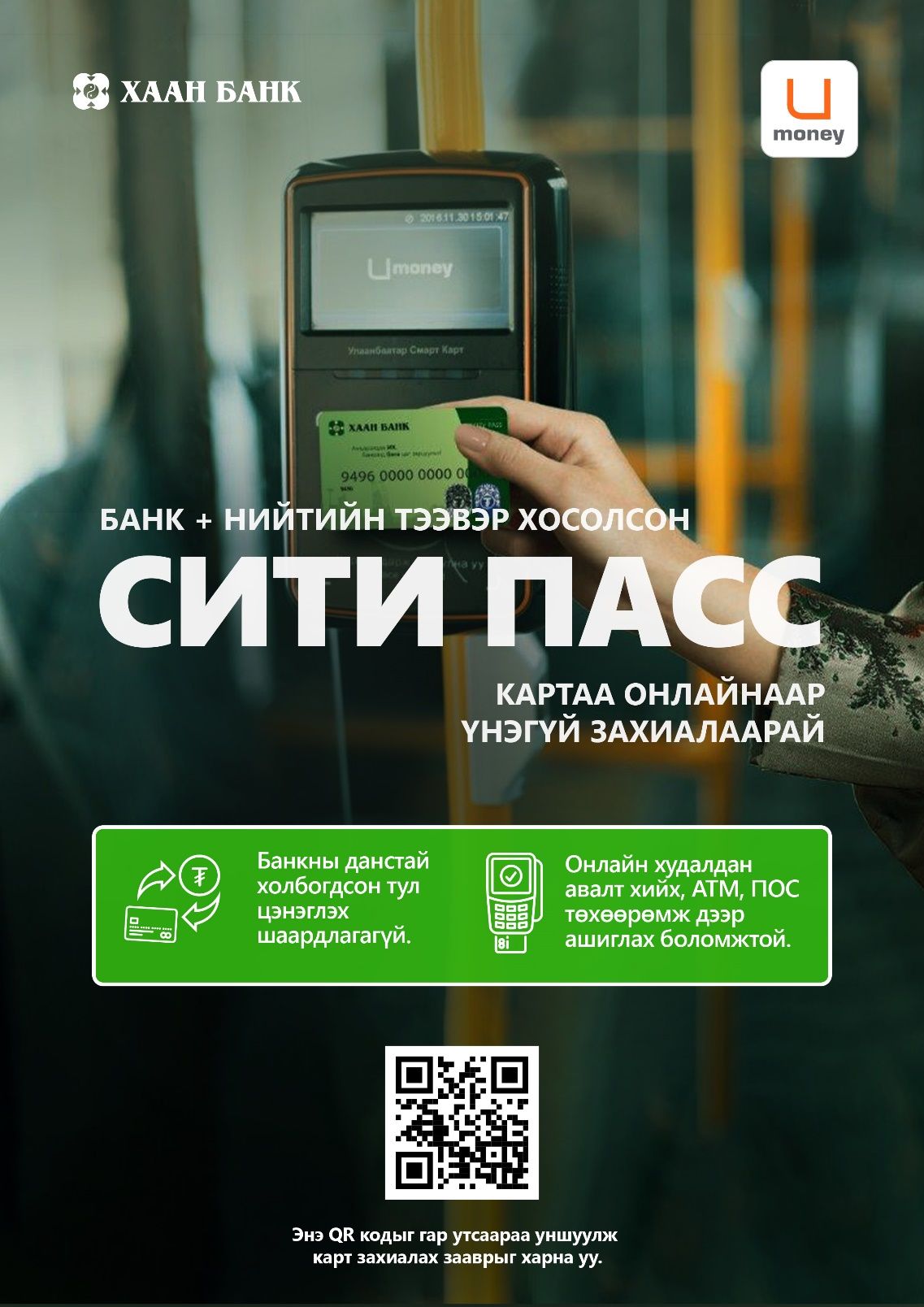 Citypass карт нь дансан дахь үлдэгдэл мөнгөөр нийтийн тээврээр үйлчлүүлэх боломжтой Хаан банкны карт бөгөөд тус картаар та банкны гүйлгээ хийх боломжтойгоос гадна автобусаар зорчихдоо төлбөрөө төлөх боломжтой. Тухайн картыг онлайнаар захиалсан тохиолдолд үнэ төлбөргүй авах боломжтой. Хаан банкны “Сити Пасс” картны үйлчилгээтэй холбоотой мэдээллийг Хаан банкны лавлах 1800-1917 дугаартай утсанд хандаж дэлгэрэнгүй мэдээлэл авах боломжтой.