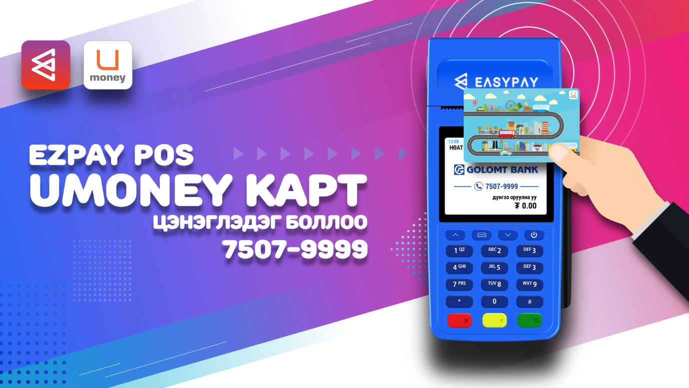 Та Голомт банкны Изипэй ПОС төхөөрөмжөөр U money карт цэнэглэдэг болсныг мэдсэн үү? Тус банкны ПОС төхөөрөмж ашиглаж буй цэгүүдээс U money картаа банкны картаар болон бэлэн мөнгөөр цаг алдалгүй цэнэглээд зорчих боломжтой. Мэдээж ямар нэгэн шимтгэлгүй юм.