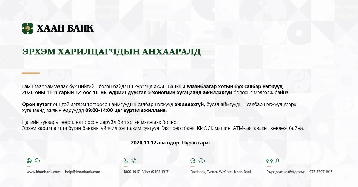 Бүх нийтийн бэлэн байдал зарласантай холбоотойгоор энэ сарын 16-ныг дуустал ХААН Банкны Улаанбаатар хотын бүх салбар нэгж болон онцгой дэглэм тогтоосон зарим аймгийн салбарууд иргэдэд үйлчлэхгүй бөгөөд бусад аймгийн тооцооны төвүүд ажлын өдрүүдэд 09:00-14:00 цаг хүртэл ажиллана.