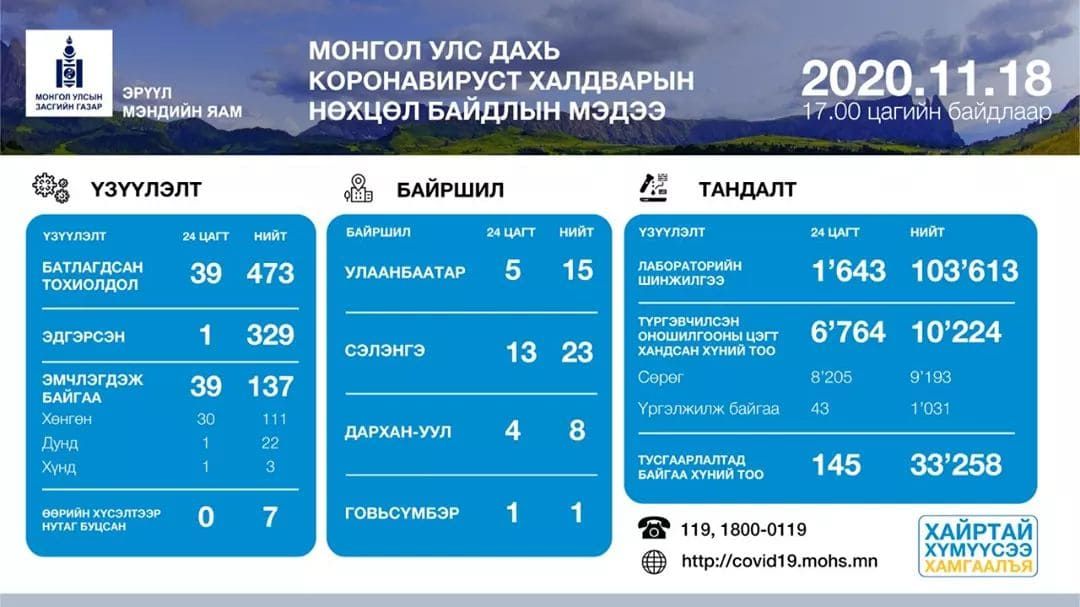 - 2020.11.17: Сэлэнгээр орж ирсэн ТИР машины хоёр жолооч, Улаанбаатарын голомтын ойрын хавьтлын нэг хүний 3 дахь шинжилгээгээр коронавирус илэрлээ"