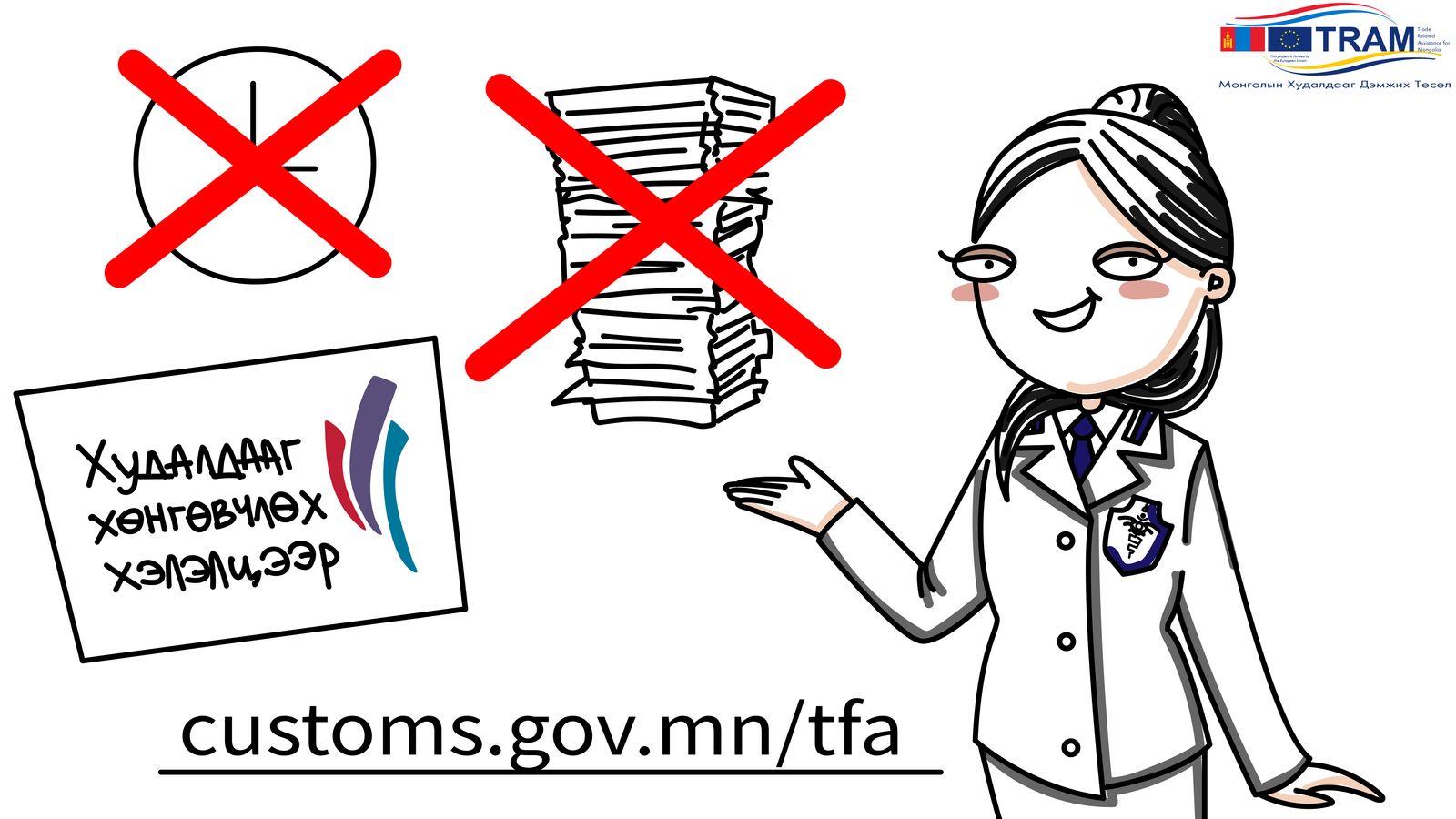 Худалдааг хөнгөвчлөх хэлэлцээрийг Монгол Улс соёрхон баталсны дөрөв дэх жилийн босгон дээр Европын Холбооны санхүүжилтээр хэрэгжиж байгаа Монголын Худалдааг Дэмжих Төсөл (ТРАМ) олон нийт, шийдвэр гаргагчид болон худалдаа эрхлэгчдэд зориулан, ДХБ-н худалдааг хөнгөвчлөх хэлэлцээр гэж юу вэ, бид эндээс чухам ямар үр ашиг хүртэх юм бэ, яагаад Монгол Улс худалдааг хөнгөвчлөх хэлэлцээрийг хэрэгжүүлэх хэрэгтэй юм бэ гэх зэрэг эл хэлэлцээрийн талаархи ойлголт мэдлэг мэдээллийг нэмэгдүүлэх, танин мэдүүлэх зорилготой цуврал мультимедиа зорилтот контентыг бэлтгэн хүргэж байгаа юм.