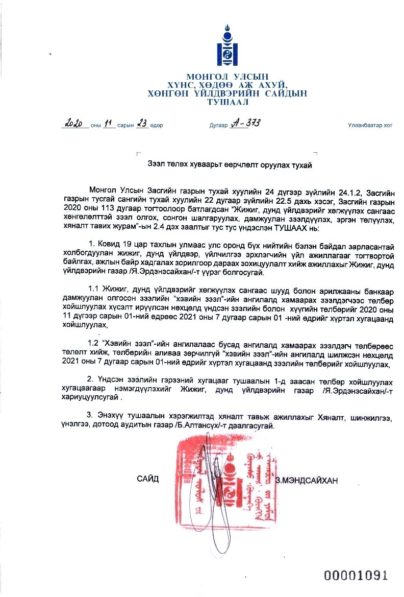 Тодруулбал, ЖДҮХС-ийн шууд болон банкаар дамжуулан олгосон “хэвийн зээл”-ийн үндсэн зээлийн төлбөр болон хүү төлөх хугацааг Жижиг, дунд үйлдвэрийн газарт ирүүлсэн зээлдэгчийн хүсэлтээр 2020 оны долоодугаар сарын 01-ний өдрийг хүртэл хугацаагаар хойшлуулахаар болсон.