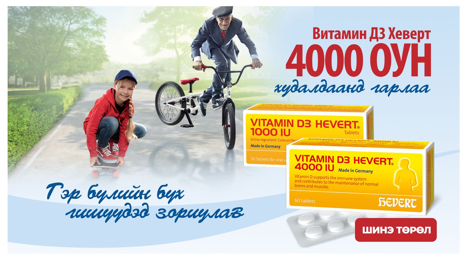 Монгол Эм Импэкс Концерн Герман улсад үйлдвэрлэсэн ВИТАМИН Д3 ХЕВЕРТ бүтээгдэхүүнийг 1000 ОУН болон 4000 ОУН гэсэн 2 төрлийг Улаанбаатар хотын болон орон нутгийн 21 аймагт байрлах салбаруудаар худалдаалж байна. Энэхүү бүтээгдэхүүн нь: