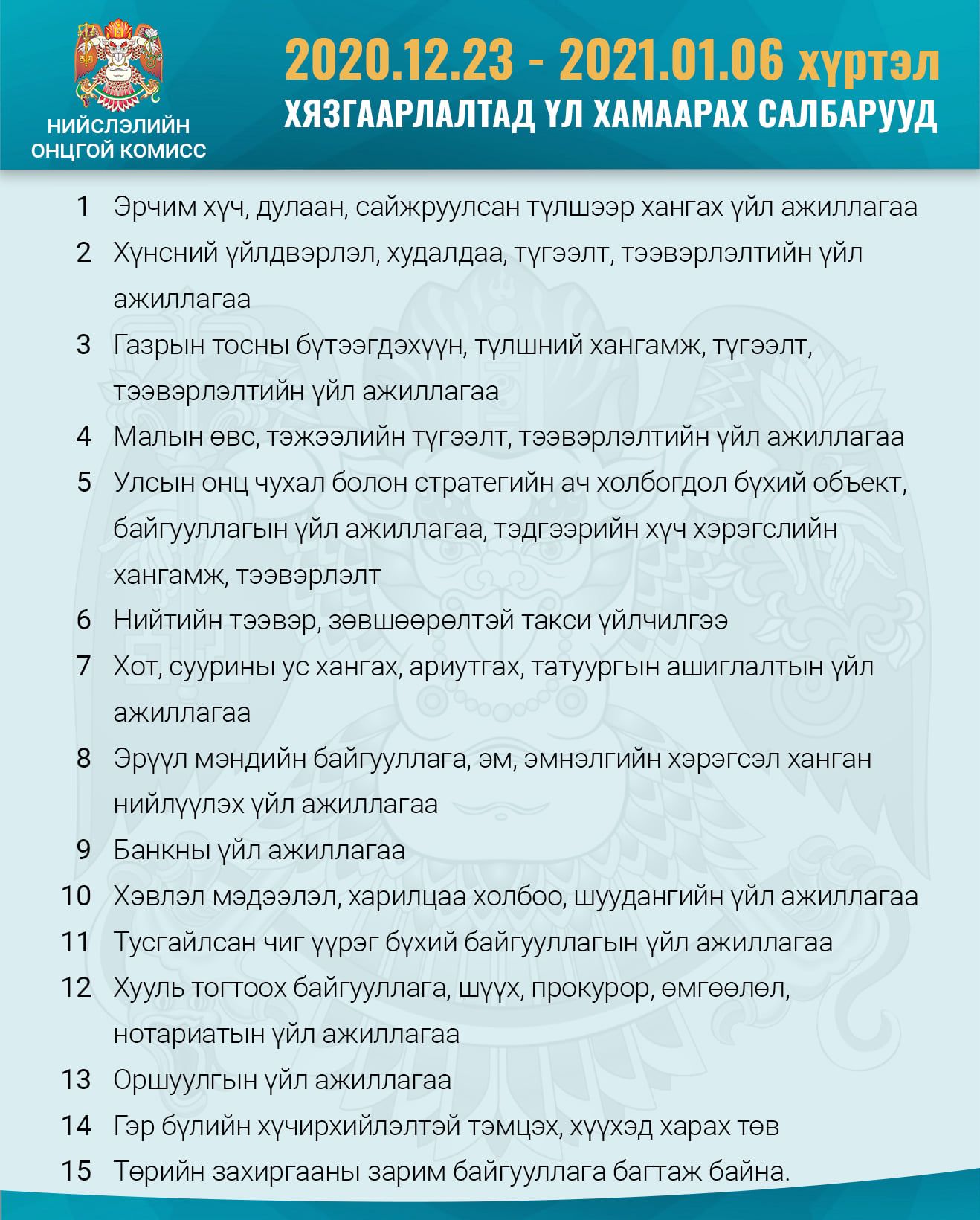 Уг захирамжид хавсралтаар баталсан 15 үйл ажиллагааны чиглэл бүхий байгууллагууд ажиллах бөгөөд тэдгээр аж ахуйн нэгж өмнө нь авсан QR код бүхий зөвшөөрлөөрөө нийслэлийн замын хөдөлгөөнд оролцоно.