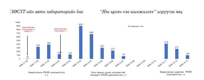 Халдварын батлагдсан тохиолдолын голомтыг өргөтгөн Батцэнгэл сумын хүн амын дунд халдварын тархалтыг тогтоох зорилгоор “Нэг иргэн-нэг шинжилгээ” идэвхитэй илрүүлэг 2020 оны 12 дугаар сарын 02-ноос 12 дугаар сарын 07-ны өдрүүдэд зохион байгуулж, сумын эрүүл мэндийн төвүүд, Нэгдсэн эмнэлэг, өрхийн эрүүл мэндийн төвүүдийн 10 лаборант, лабораторийн эмч ажилласан.