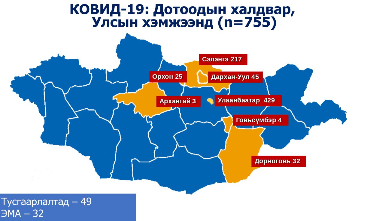 - 2020.11.21: Улаанбаатарт 6, Сэлэнгэд 5, Дорноговьд 6, Орхон аймагт 4 тохиолдол тус тус шинээр бүртгэгдэж нийт 578 тохиолдол бүртгэгдсэн байна.