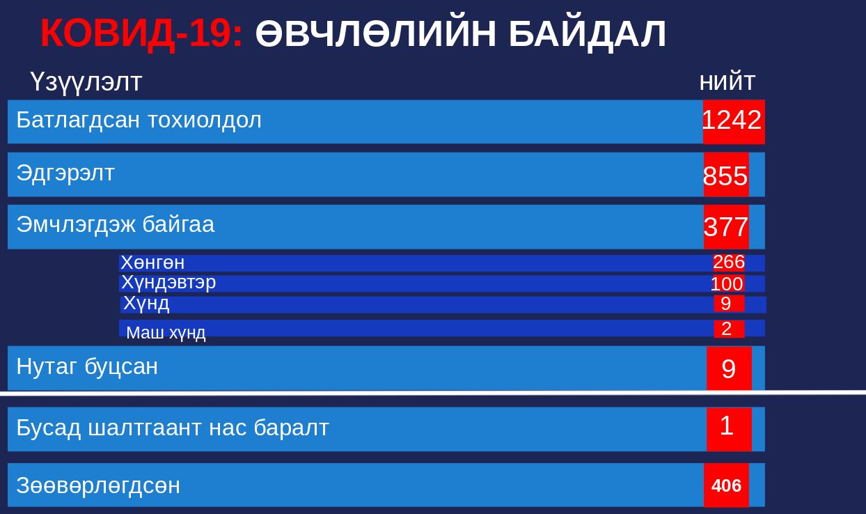 - 2020.12.30: 20 хүнээс коронавирус илэрч, улсын хэмжээнд батлагдсан тохиолдол 1,195 бүртгэгдэж байна