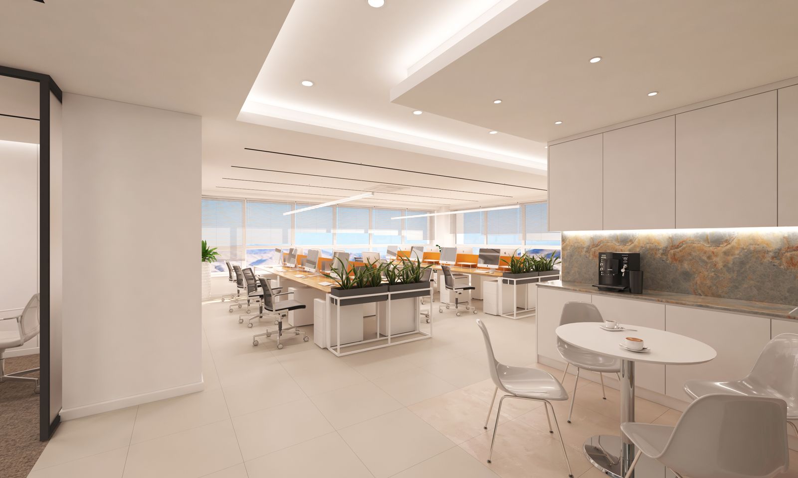 Амьдралын онцгой нэгэн хэсэг өрнөдөг ажлын орчин нь эрч хүч, зорилго тэмүүллээр дүүрэн бүтээлч байх хэрэгтэй. UB Tower Plus төслийн оффис бүрт захиралын өрөө, уулзалтын хэсэг, хурлын заал, ажилчдын хамтын ажиллагаа бүтээмжийг дээшлүүлэх хэсэг буюу чөлөөт буюу задгай орон зай, цайны булан гэсэн хэсгүүд төлөвлөх боломжийг судлаж өрөөний хуваалтыг төлөвлөсөн.