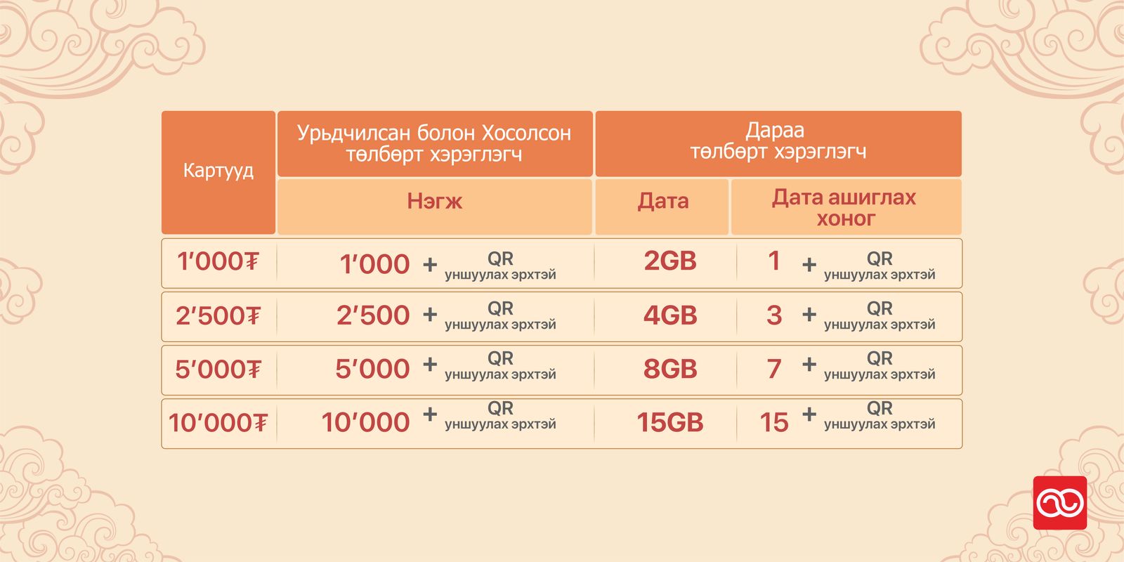 Урьдчилсан болон Хосолсон төлбөрт хэрэглэгчид 1000₮, 2500₮, 5000₮, 10000₮-ийн картаар цэнэглэхэд үндсэн нэгж орох бол Дараа төлбөрт хэрэглэгчид сонгосон картаас хамаарч 2GB-15GB хүртэлх дата багц идэвхэжнэ. Мөн та бэлгийн картаар цэнэглэх бүрдээ QR код уншуулж бэлэг авахаас гадна 2 дугаар сарын 15, 22-ны өдөр болох тохиролд оролцож, ухаалаг утас хожих 9 хэрэглэгчийн нэг болох боломжтой.