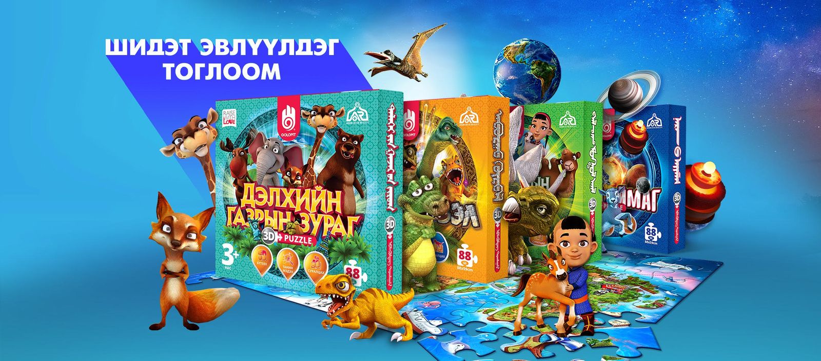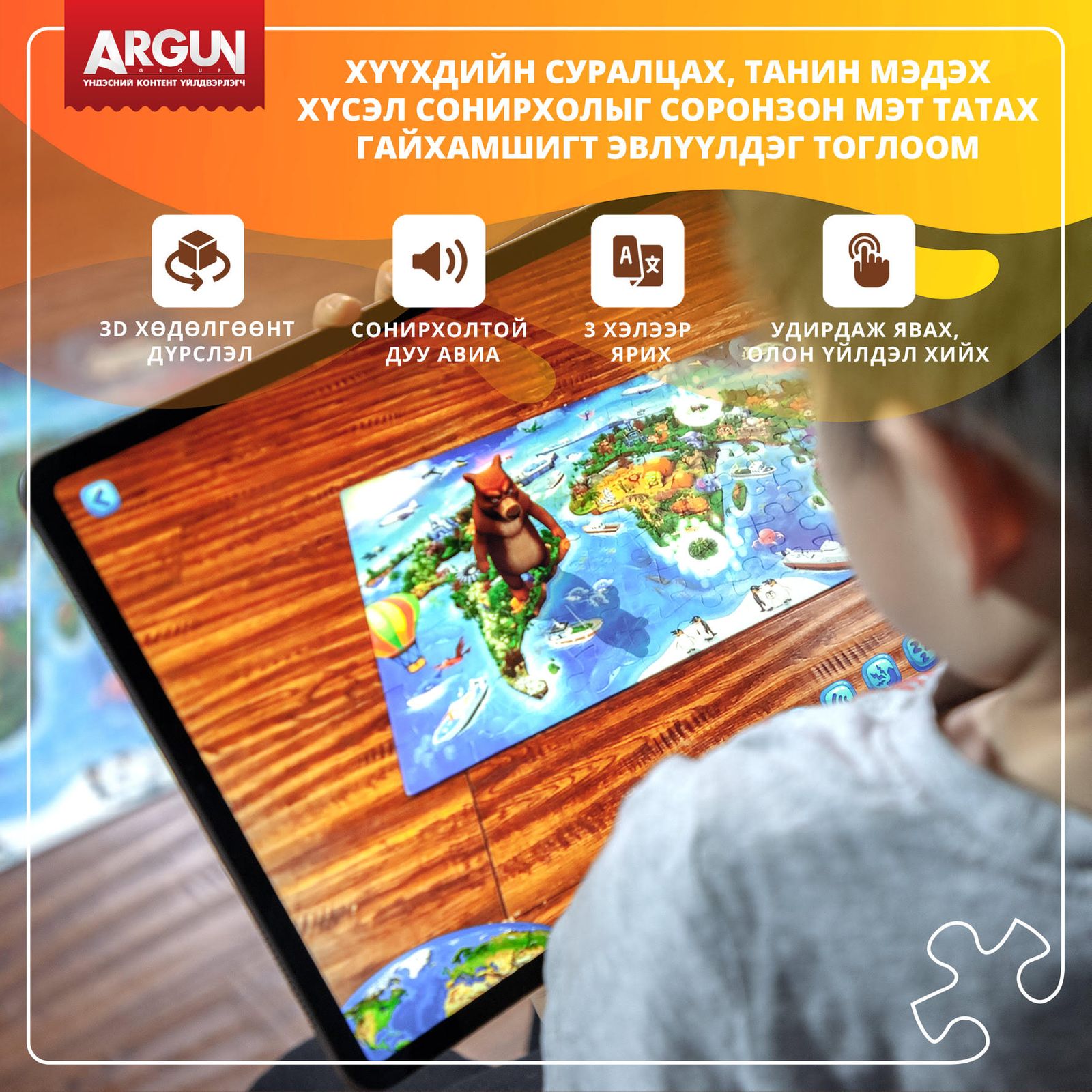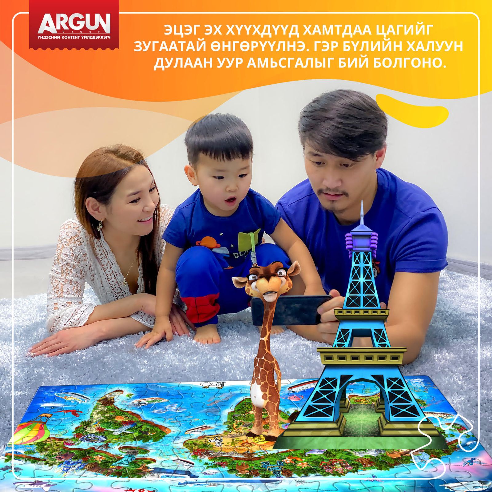 Дэвшилтэт AR технологиор баяжуулснаар Дэлхийн газрын зураг эвлүүлдэг тоглоом нь хүүхдэд Тив далай, ан амьтад, дэлхийн гайхамшиг гэх мэт дэлхийн газарзүйн талаар бүрэн мэдлэгийг Англи, Монгол, Хятад хэлээр таны хүүхдэд маш сонирхолтой байдлаар олгох болно.