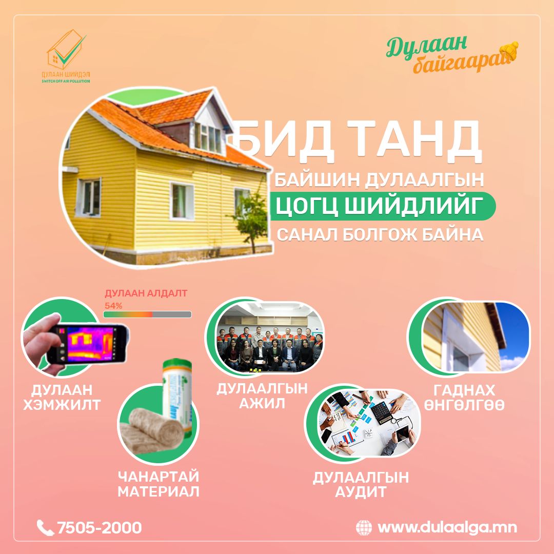 Иймд иргэд та бүхэн “Дулаан Шийдэл” төсөлд хамрагдан, байшингаа дулаалуулахыг хүсвэл 7505-2000 дугаарын утас, www.dulaalga.mn цахим хуудас, “Дулаан Шийдэл Төсөл” фэйсбүүк хуудсаар тус тус холбогдож төслийн багаас мэргэжлийн зөвлөгөө аваарай.