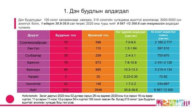 Улаанбаатар хотод байгаа дэн буудлууд нэг өдөрт 30.8-39.6 сая төгрөг алддаг бөгөөд 2020 оны турш 310 хоногийн турш хаалттай болон орлого байхгүй ажиллахад 9 тэрбум 576сая -12 тэрбум 300 сая төгрөгийн алдагдал хүлээснийг дээрх судалгаанаас харж болохоор байна.