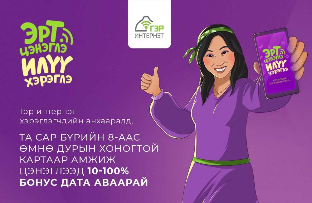 Тэгвэл Гэр интернэтийн хэрэглэгчдийн хувьд сар бүрийн 8 чухал өдөр байдаг. Энэ нь өсөн нэмэгдэх бонус дата авах ЭРТ ЦЭНЭГЛЭДЭГ өдөр юм. Энэ урамшууллын талаар мэдээлэлгүй хэрэглэгчдийн хувьд дэлгэрэнгүй мэдээллийг https://www.unitel.mn/unitel/promotion/541 холбоосоор авахыг зөвлөж байна.