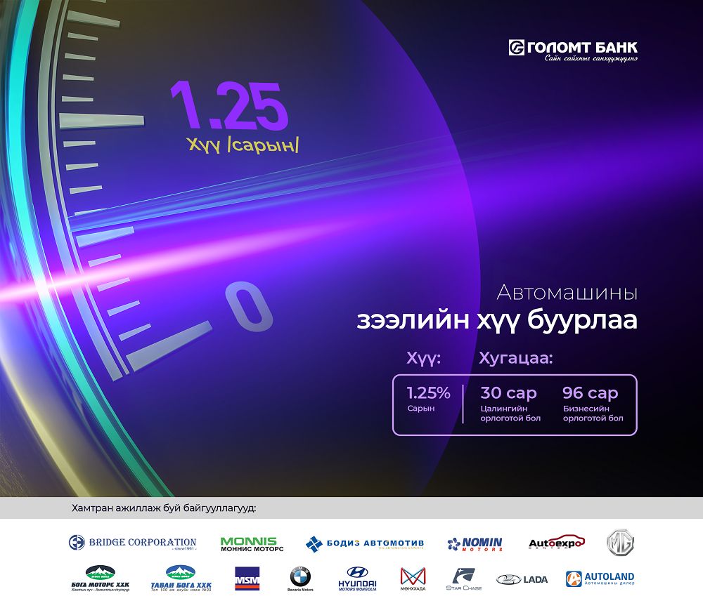- Голомт банкны хувьд автомашины зээлийн бүтээгдэхүүн, үйлчилгээг дэлхийн жишиг стандартад нийцүүлэн харилцагчдадаа хүргэхийн тулд 2017 оноос хойш автомашины зах зээл дээр төвлөрч ажиллаж байна. Энэ ч утгаараа зах зээл дээрх хамгийн таатай нөхцөлийг санал болгож байгаа юм. Хамтран ажиллах гэрээ бүхий албан ёсны дилер 15 байгууллагын автомашины зээлийн хүүг 1.25% болж бууруулаад байна. Тухайлбал банкнуудын хэрэглээний зээлийн дундаж хүүгийн хэмжээ 1.5-1.7% байхад автомашины зээлийн хүүг 1.25% хүртэл бууруулж байгаа нь харилцагчид маань хүүгийн зардлаа 20-25% хэмнэхээр харагдаж байна. Нөгөөтэйгүүр бидний мэдэх уламжлалт автомашины зээлийн бүтээгдэхүүн маань зөвхөн харилцагчийн хүссэн автомашиныг зээлээр худалдан авахад төвлөрдөг байсан нь км гүйлт ухраасан, ямар нэгэн эвдрэл гэмтэлтэй, осол аваарт орсон автомашин худалдан авах зэрэг эрсдэл багагүй үүсгэдэг байсан. Энэ ч утгаараа банк харилцагчдын аюулгүй байдал, хөрөнгийн чанар, үнэ цэнэ зэрэг олон үзүүлэлтээр харж зөвлөх хэрэгцээ шаардлага үүсэж байгаа тул худалдан авах автомашиныг мэргэжлийн байгууллагын бүтэн оношлогоонд оруулах, зөвлөгөө өгөх, тэнцсэн тохиолдолд автомашинд 1 жилийн баталгаа өгч байгаагаар давуу талтай юм.