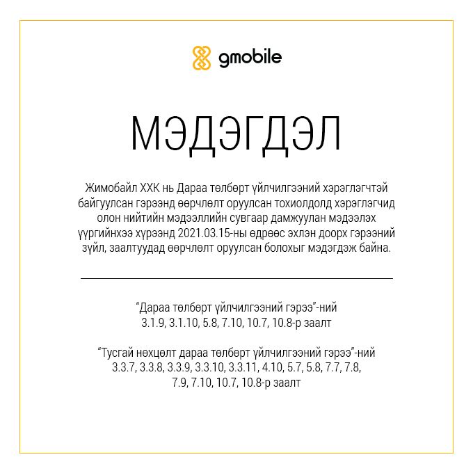 Жимобайл ХХК нь Дараа төлбөрт үйлчилгээний хэрэглэгчтэй байгуулсан гэрээнд өөрчлөлт оруулбал хэрэглэгч, олон нийтэд мэдээлэх үүргийн хүрээнд мэдэгдэж байна.