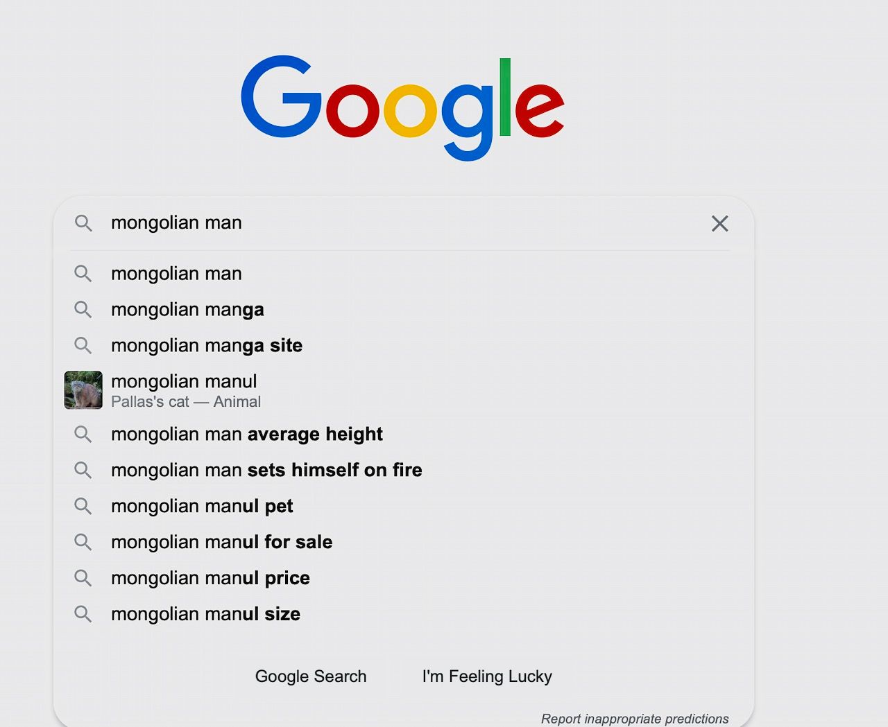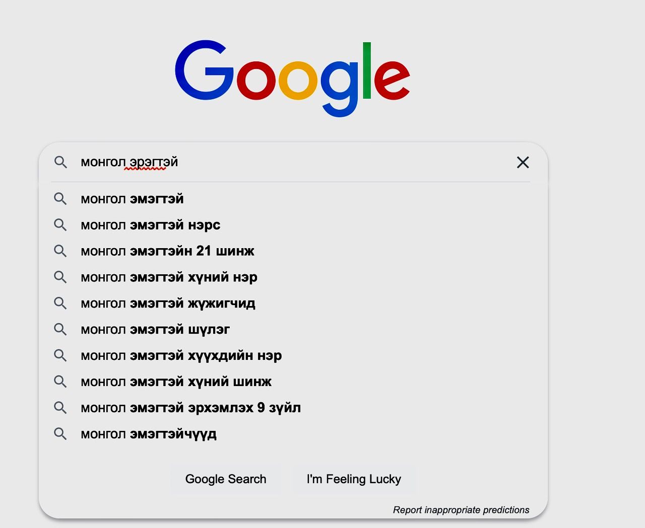 Энэ нийтлэлд өгүүлснээр тухайн үед Google хайлтын системийн цонхонд “mongolian man”, “монгол эрэгтэй” гэсэн түлхүүр үгнүүдийг оруулахад дараах сэдвүүдийг санал болгож байсан байна.