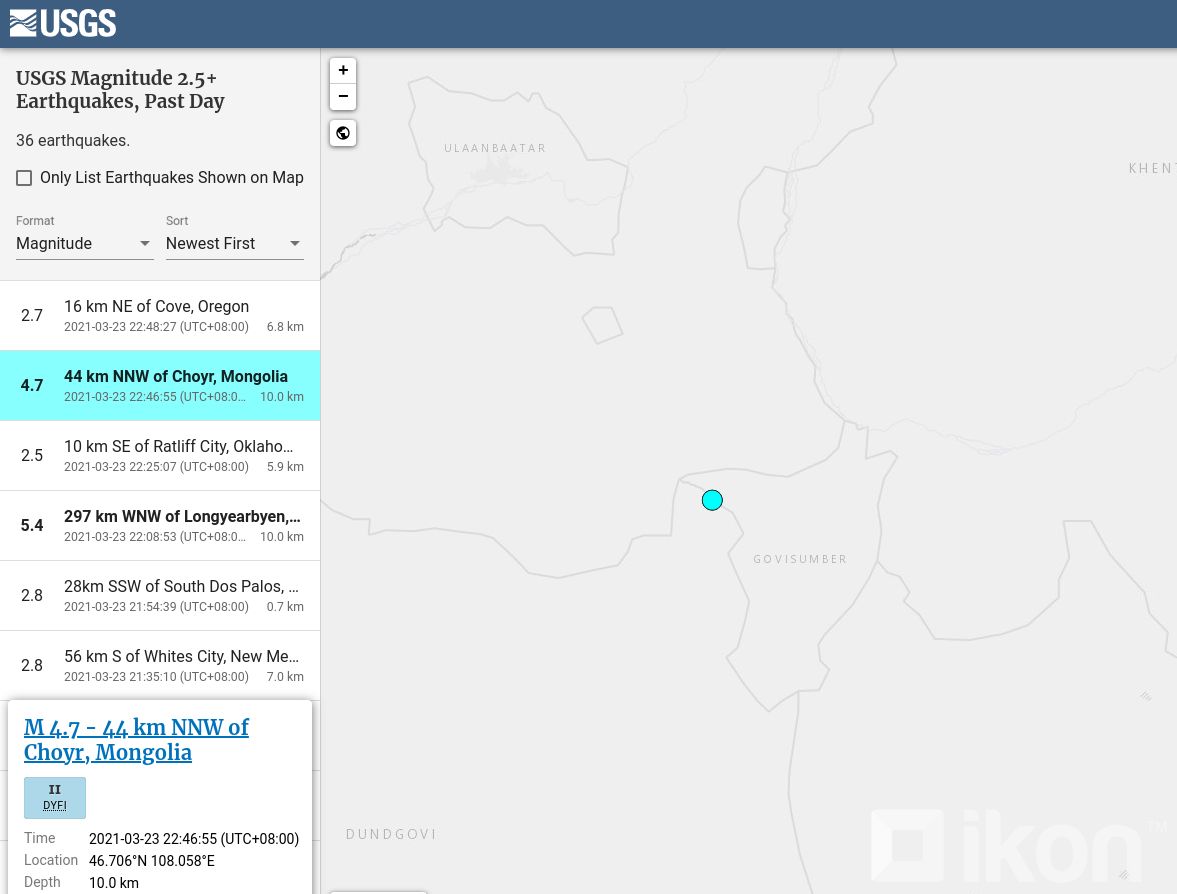 Уг газар хөдлөлтийн тухай АНУ-ын Геологийн судалгааны хүрээлэнгээс мэдээлэхдээ 10 километрын гүнд 4.7 магнитуд хүчээр газар хөдөлсөн гэжээ.
