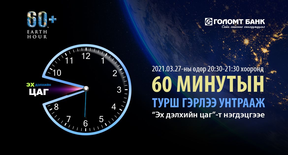 Дэлхий дахин “Эх дэлхийн цаг”-аар буюу жил бүрийн гуравдугаар сарын сүүлийн бямба гаригийн 20:30-д нэг цагийн турш нэгэн зэрэг гэрлээ унтраадаг. Үүний дагуу энэ жил 2021.03.27-нд буюу энэ Бямба гарагт уг өдөр тохиож байгаа бөгөөд 20:30-21:30 цаг хүртэл хүн бүрийг гэрлээ унтраан эх дэлхийн цагт нэгдэж, байгаль орчинд хувь нэмрээ оруулахыг уриалж байна. Бид гэрлээ унтраана. Харин та?