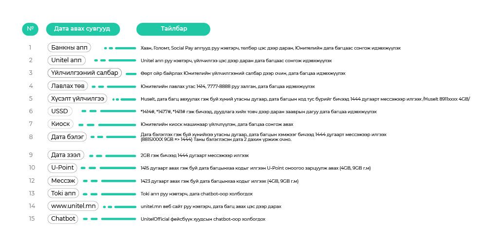 Ингэхдээ банкны аппаараа нэвтэрч, төлбөр цэс дээр даран Юнителийн дата багцаас сонгоорой. Мөн дараах сувгуудаар ч авах боломжтой аж.