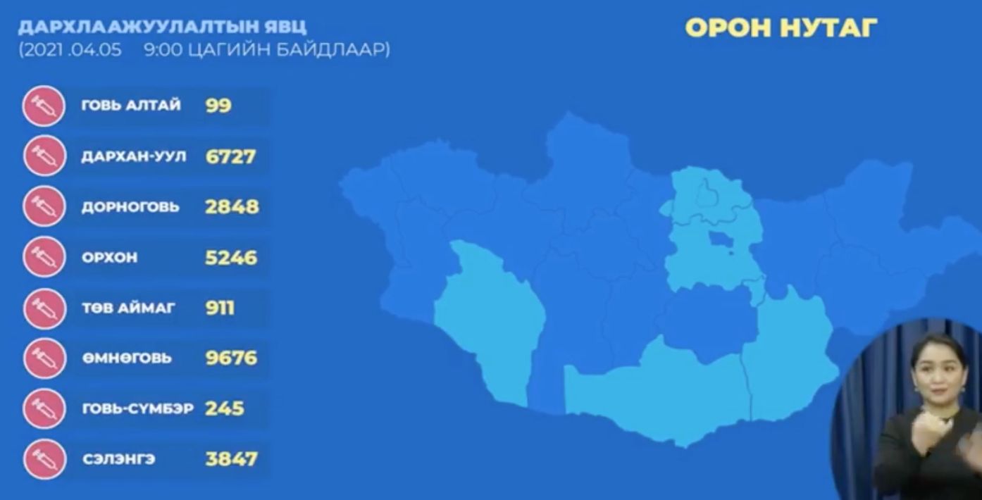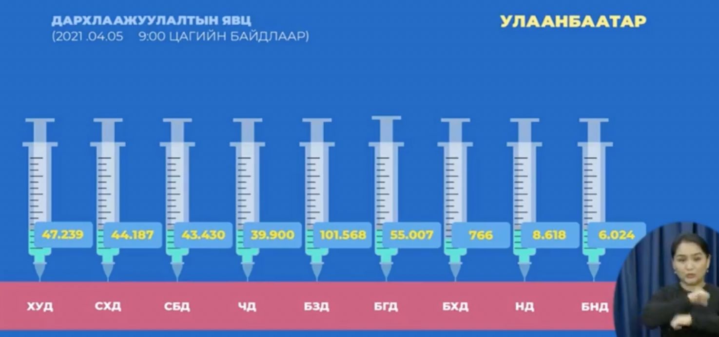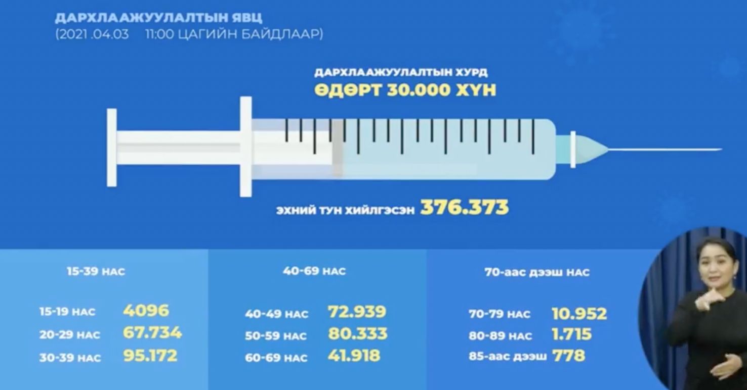ЭМЯ-ны ээлжит хэвлэлийн хурлын үеэр дархлаажуулалтын ажлын явцын мэдээг танилцууллаа. Өнөөдрийн байдлаар улсын хэмжээнд 376,373 хүн вакцины эхний тунг хийлгээд байна.