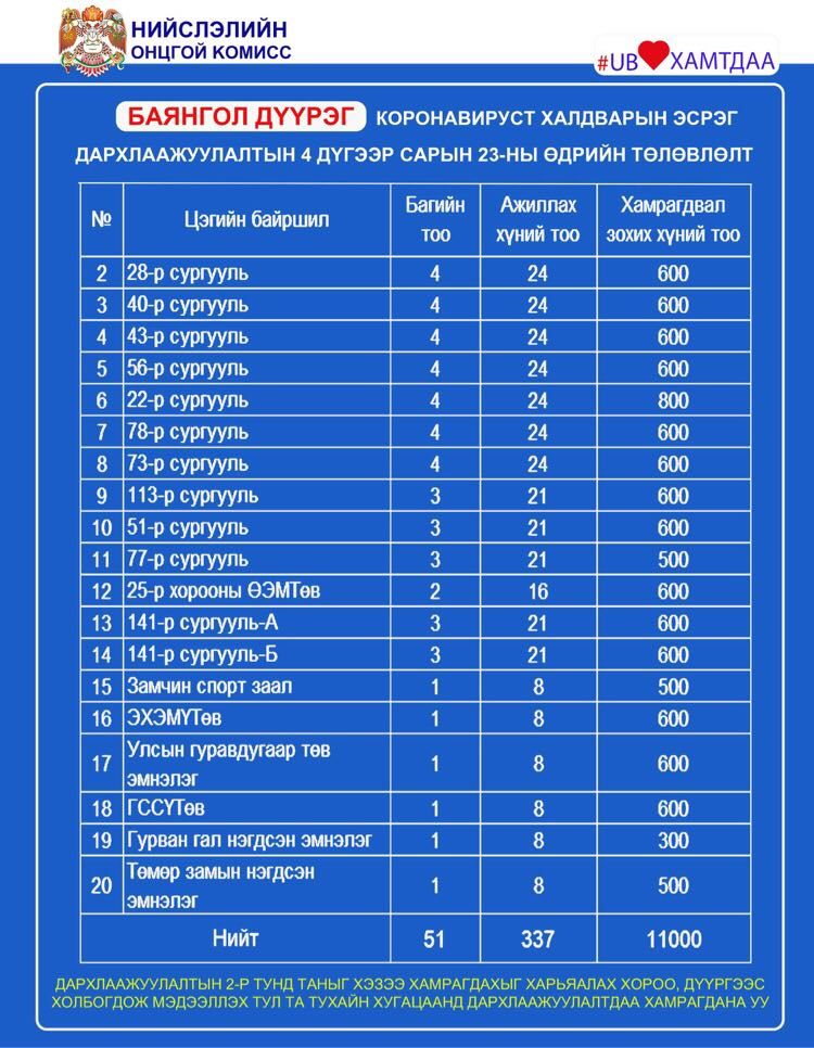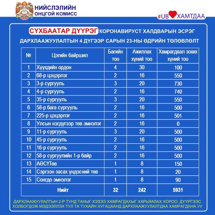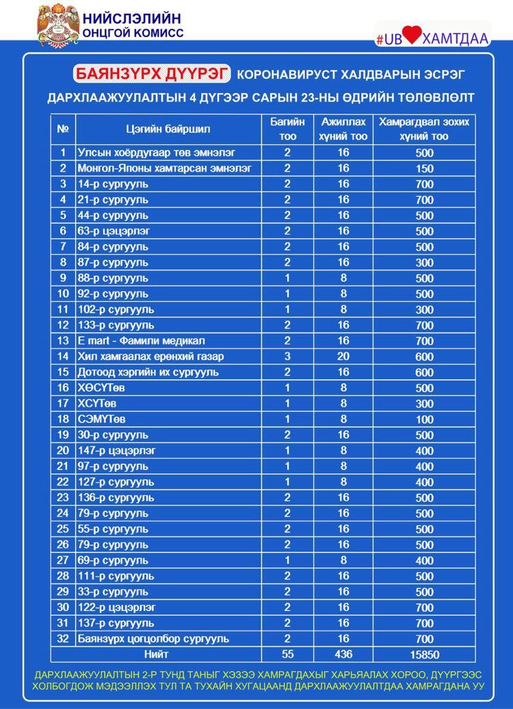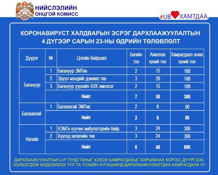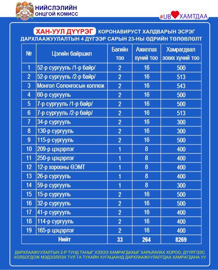 Суурин 120 цэг болон явуулын 40 цэгээр давтан тунгийн 49 мянга, эхний тунд өмнө нь хамрагдаж амжаагүй 55-аас дээш насны иргэд гэрт ойр цэгүүдэд халдвар хамгааллын дэглэмээ бариад хамрагдана гэдгийг УОК-ын хэвлэлийн төлөөлөгч мэдэгдсэн.