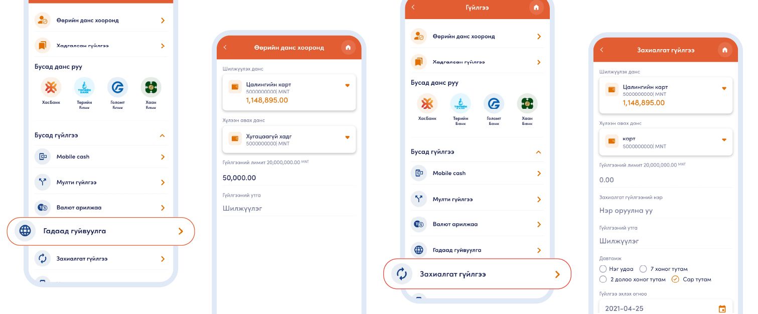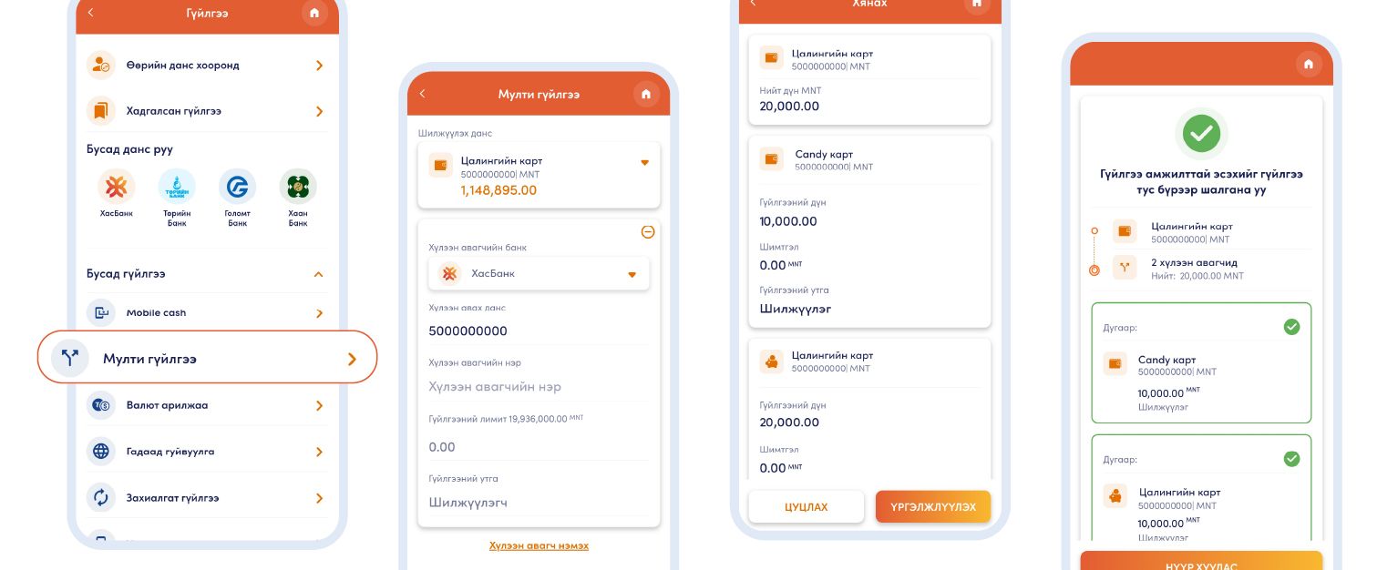 Тав хүртэлх данс руу өөр өөр үнийн дүнг ялгаатай гүйлгээний утгатайгаар нэгэн зэрэг шилжүүлж, хоромхон зуурт хурууныхаа үзүүрээр гүйлгээний бүх асуудлаа шийдээрэй!