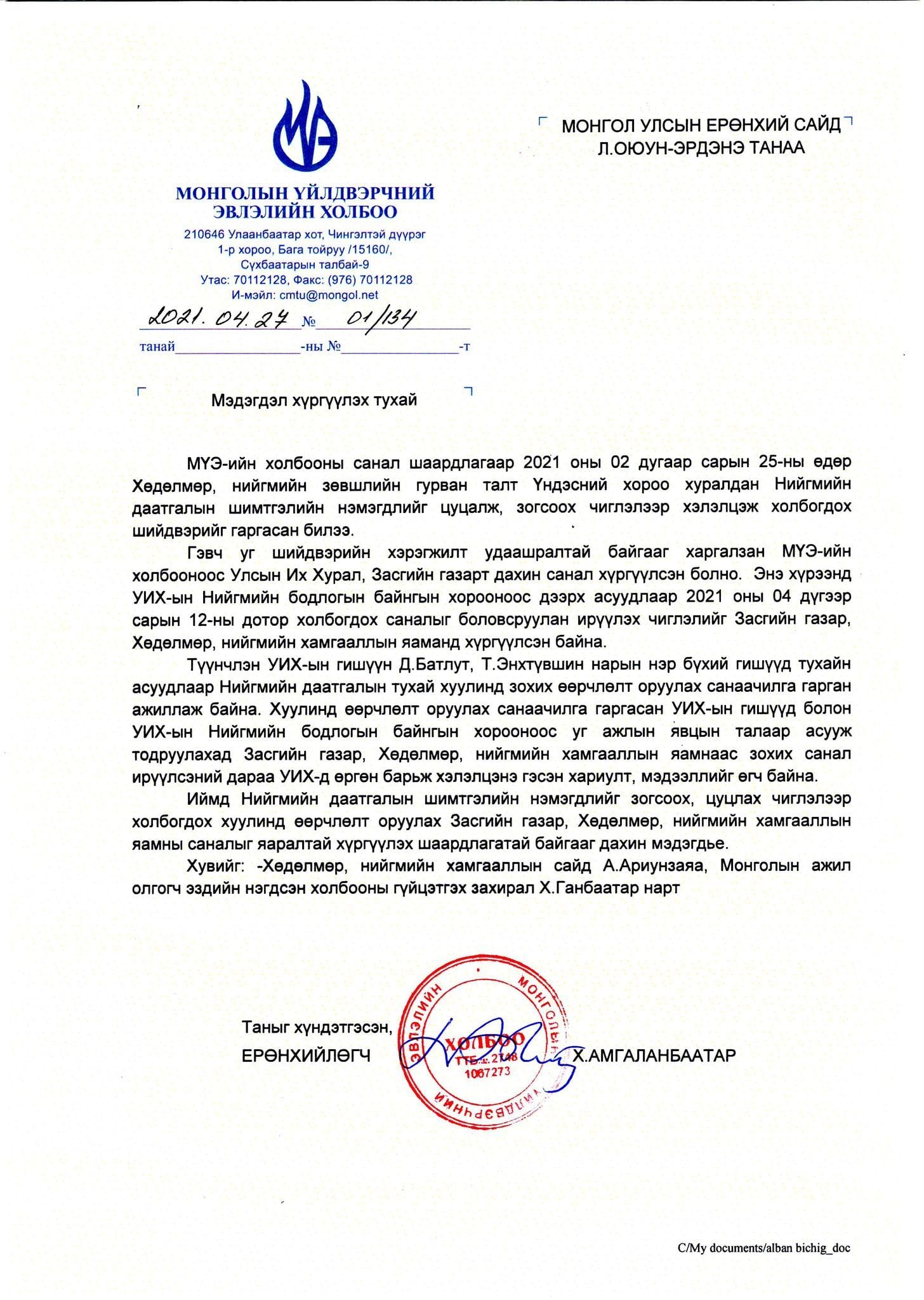 Дэлхийн улс орнууд эв санааны нэгдлийн өдөр иргэд хөдөлмөрчдийнхөө тулгамдсан асуудлыг шийдвэрлэхийн төлөө дор бүрнээ хамтран ажилладаг. Эл жишгийн дагуу цар тахлын үед энэ хатуу шийдвэрээ цуцлахыг Монголын Үйлдвэрчний эвлэлийн холбоо дахин сануулж, Засгийн газрын тэргүүн Л.Оюун-Эрдэнэд цар тахлын үеийн дүрмийн дагуу хүргэж өгөөд ирлээ.