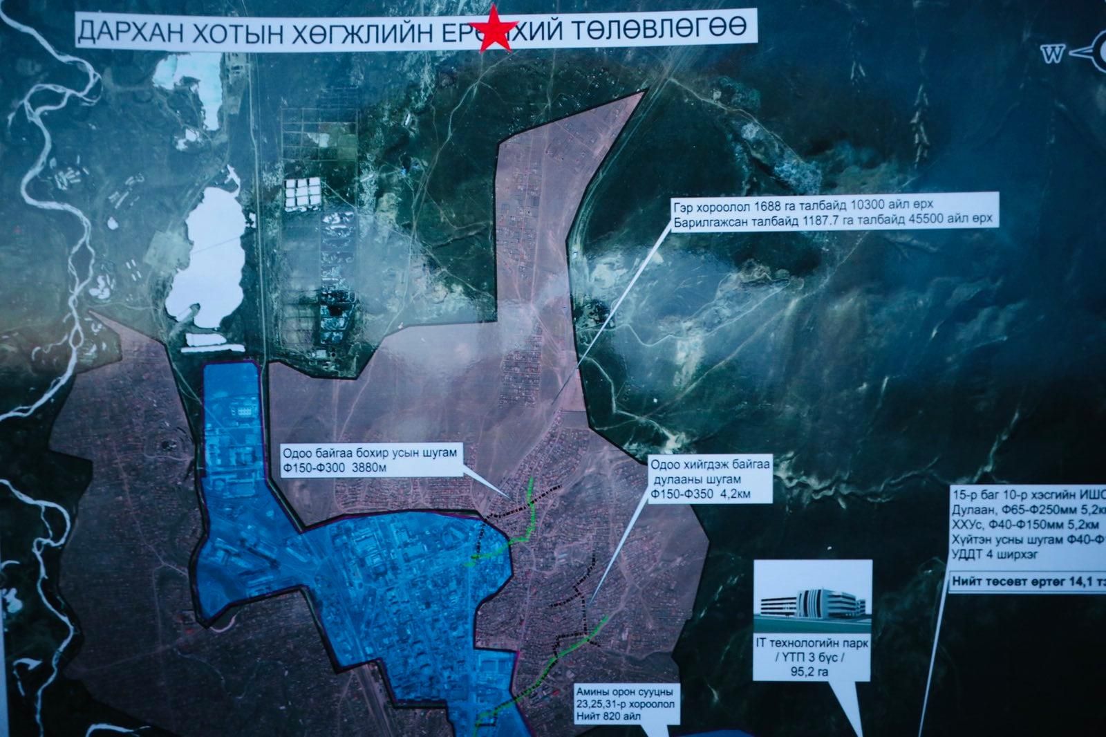 Тус төслийг хэрэгжүүлэхэд төрөөс дэмжлэг шаардлагатайг хэллээ. Тодруулбал ерөнхий төлөвлөгөөний дагуу 2035 он хүртэл хугацаанд 100,000 айлын орон сууц барихаар тусгасан бөгөөд тухайлбал Дархан-Уул аймгийн төвийн Дархан сумын 15-р багийн 2,524 өрхийн 8,500 гаруй иргэнийг орон сууцжуулах аж.