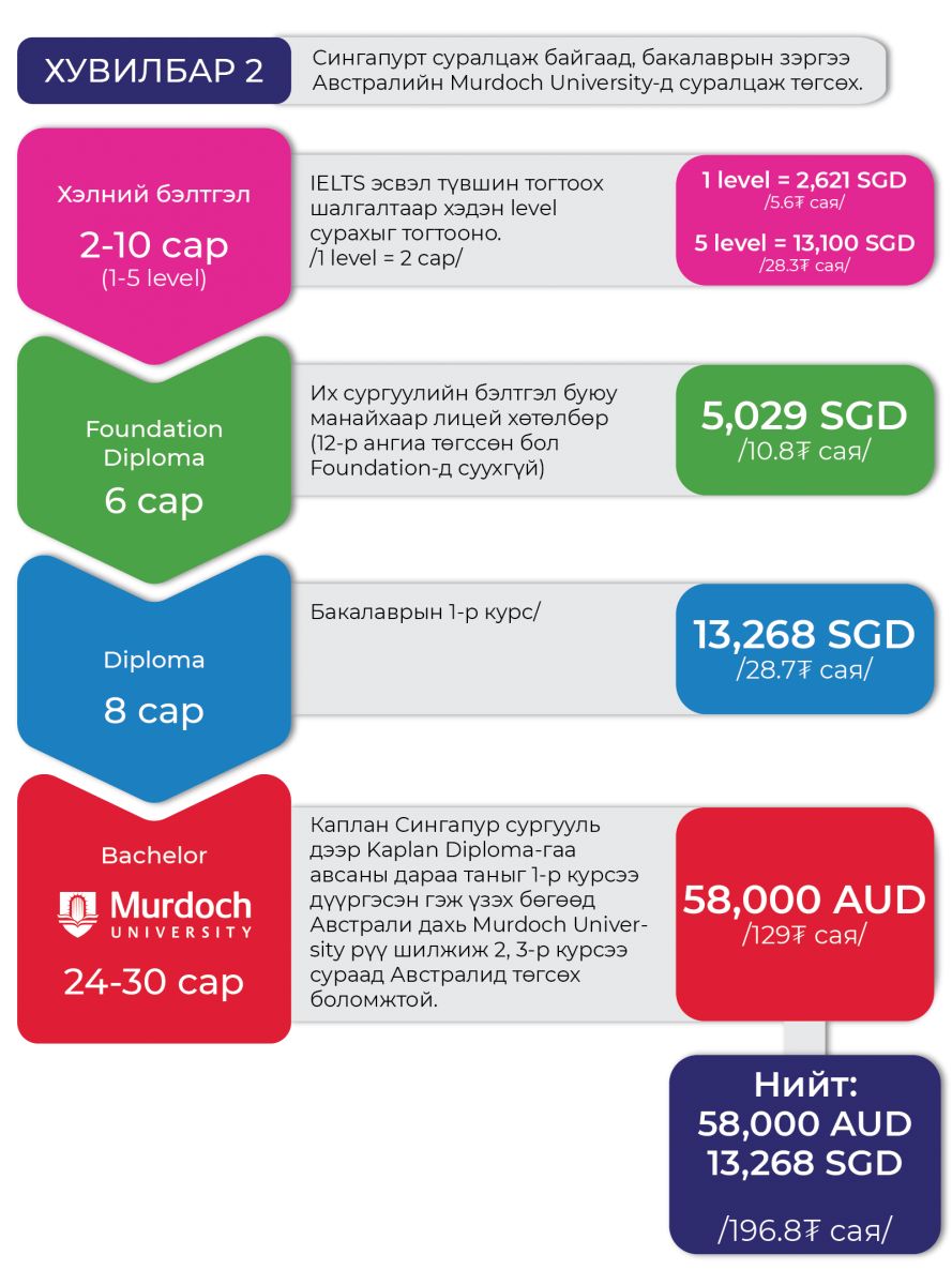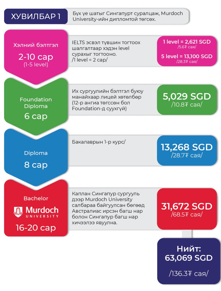 Маш энгийндээ та хэлний бэлтгэл, их сургуулийн бэлтгэл, их сургуулийн 1-р курсийг Kaplan Higher Education Institute-д сурч дүүргээд > Австралийн Murdoch University таныг 2-р курстээ хүлээж авах юм. Ингэхдээ нэг бол Сингапурт эсвэл Австралийн кампус руу алинд нь ч сурах боломжтой юм.