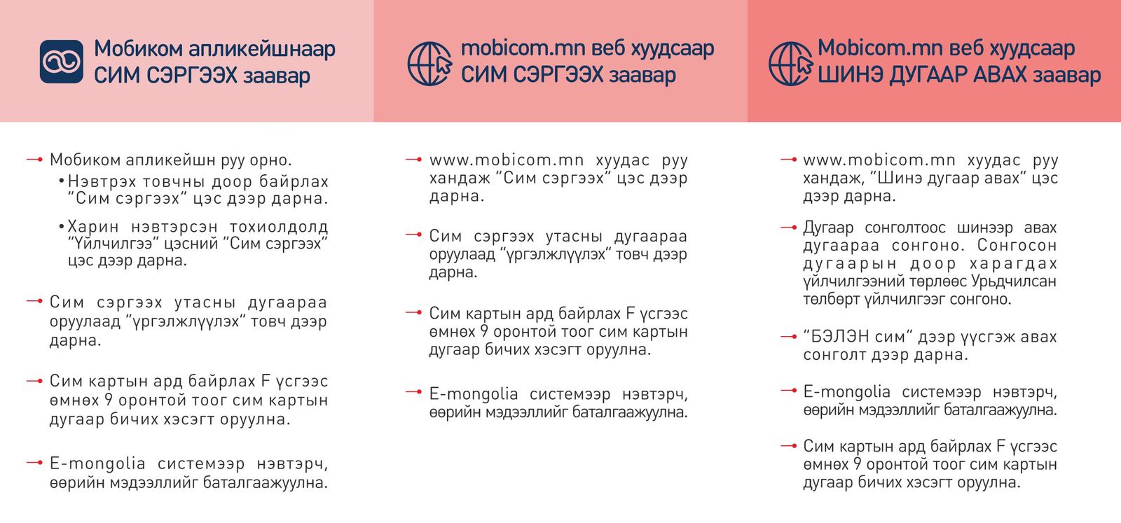 Иймд дээрх хэрэглэгчдийн хувьд өөрт ойрхон Мобикомын үндсэн болон гэрээт салбараар очиж үйлчлүүлэхийг зөвлөе.