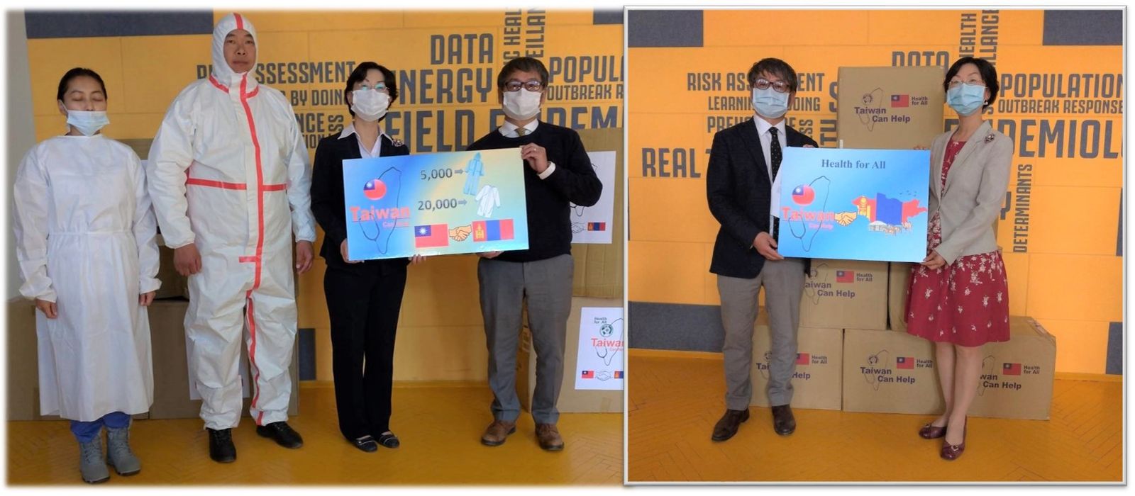 Өнгөрсөн онд Тайваний Засгийн газрын зүгээс 20.000 ширхэг халдвар хамгааллын хувцас, 5.000 ширхэг тусгаарлалтын бүсэд ашиглах эмнэлгийн зориулалтын хамгаалах хувцас, 200 мянган ширхэг амны хаалт зэрэг халдвар хамгааллын хэрэгслийг Монгол Улсад хандивласан. (Баруун талын гэрэл зураг, гэрэл зургийн эх сурвалж: Тайваниас Монгол Улсад суугаа төлөөлөгчийн газар)