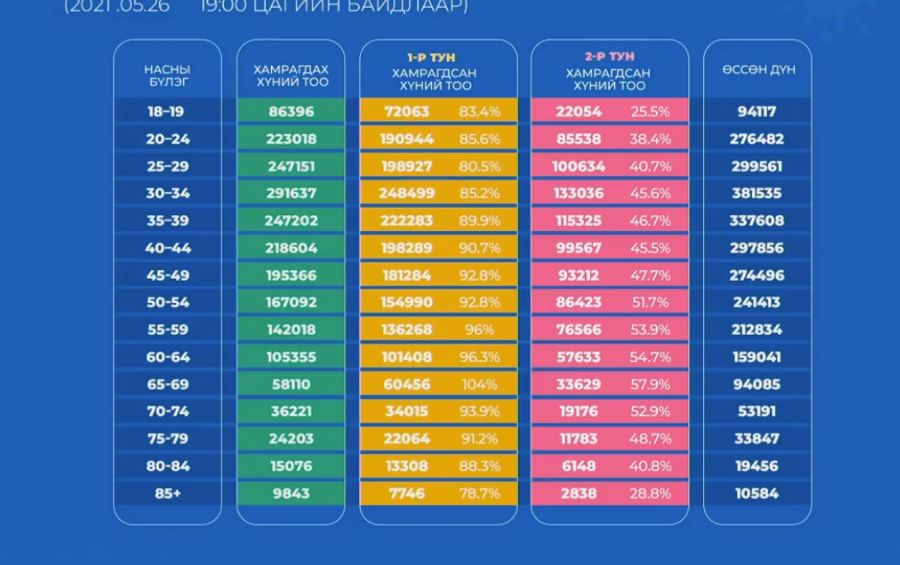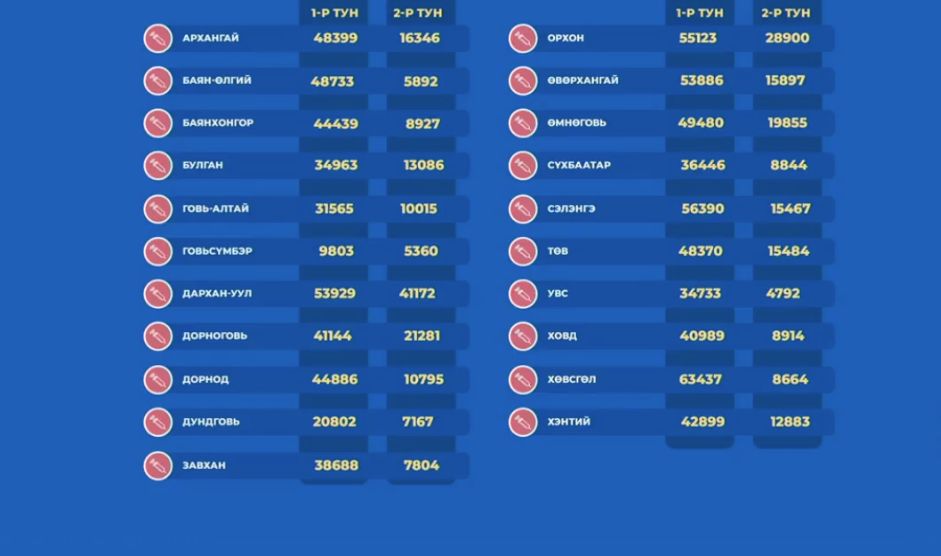 Улаанбаатар хотын хувьд 944,531 хүн вакцинд хамрагдсанаас 656,704 хүн хоёрдугаар тунг хийлгэсэн байгаа юм.