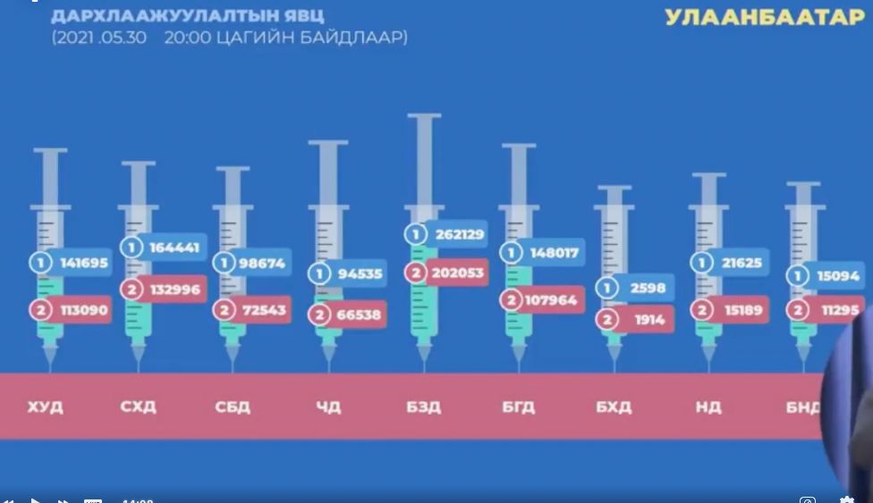 Улаанбаатар хотын хувьд 948,808 хүн вакцины нэгдүгээр тунг хийлгэсэн бол 723,582 хүн хоёрдугаар тунг аваад байгаа юм.