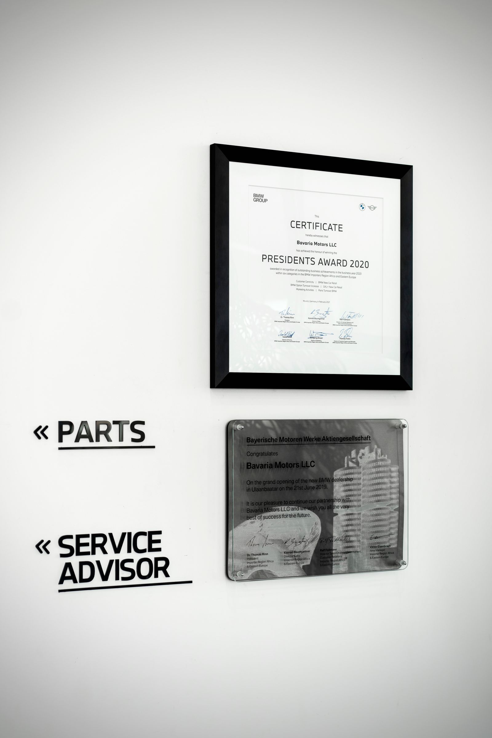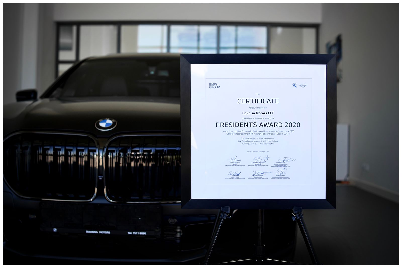 BWM корпорац нь доорх 6 ангиллын нийлбэр дүнгээр бүсүүдийнхээ шилдэг дилерүүдийг тодруулан “President Awards” шагналыг гардуулдаг. Монгол улсад үйл ажиллагаагаа явуулж буй BMW брэндийн албан ёсны дилер “Бавариа Моторс” ХХК нь хамгийн өндөр оноогоор Африк, Зүүн Европын бүсээ тэргүүлж “President Awards 2020” шагналын эзэн боллоо.