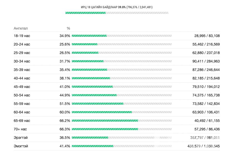 Уншигч та "Сонгууль-2021" гэсэн хуудас руу нэвтэрч аймаг, дүүргийн нэр дээр хулганаа даран сонгогчдын хүйс, нас болон ирцийн талаарх дэлгэрэнгүй мэдээллийг харна уу.