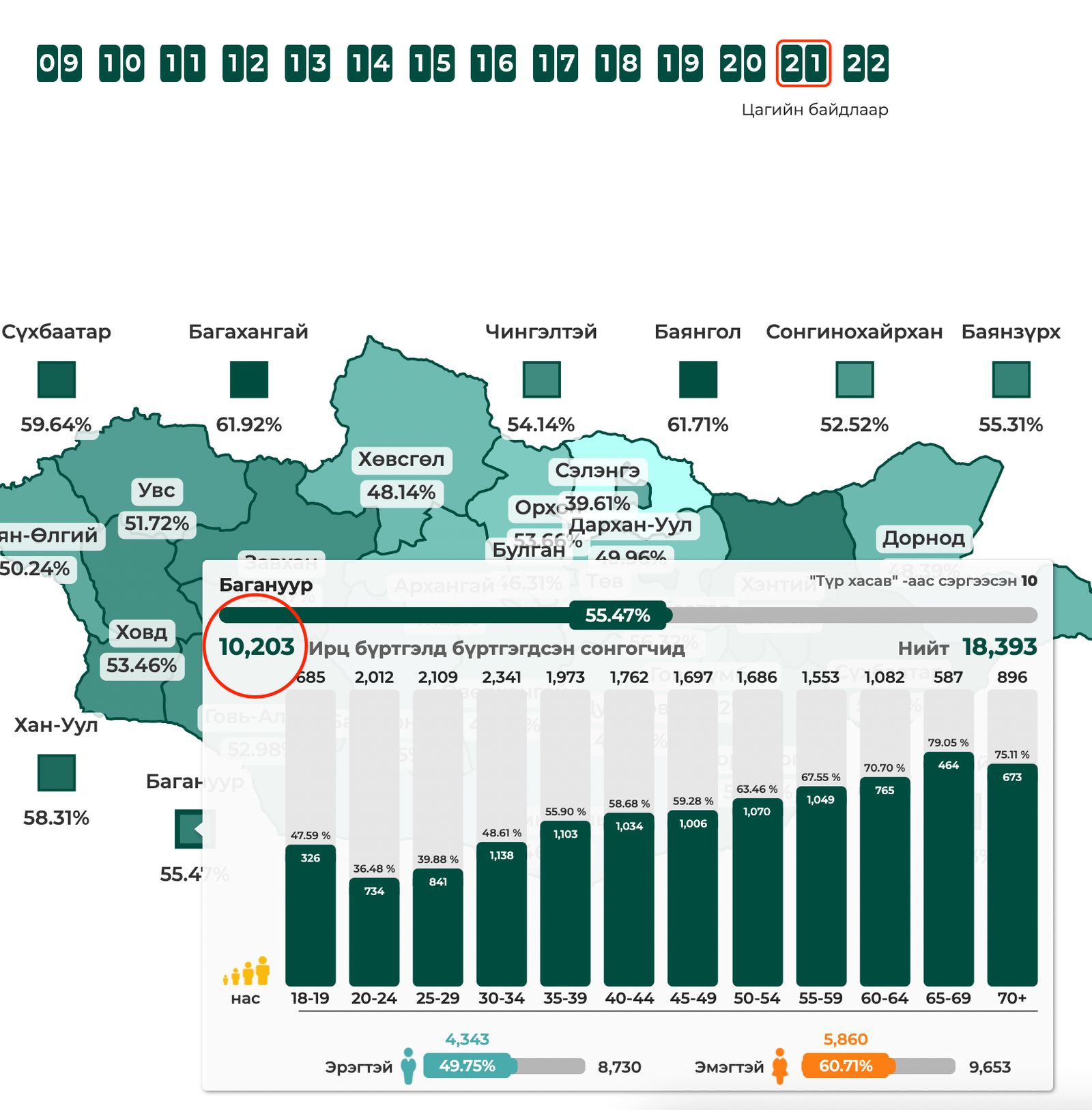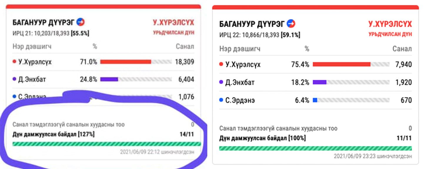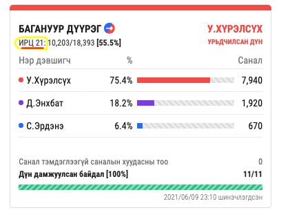 Түүнчлэн тус дүүргийн 22:00 цагийн байдлаарх ирцийн мэдээллийг оруулах хүртэл "Сонгууль-2021" хуудсан дээрх мэдээлэл 21:00 цагийн ирцээр харагдаж байсан болно.