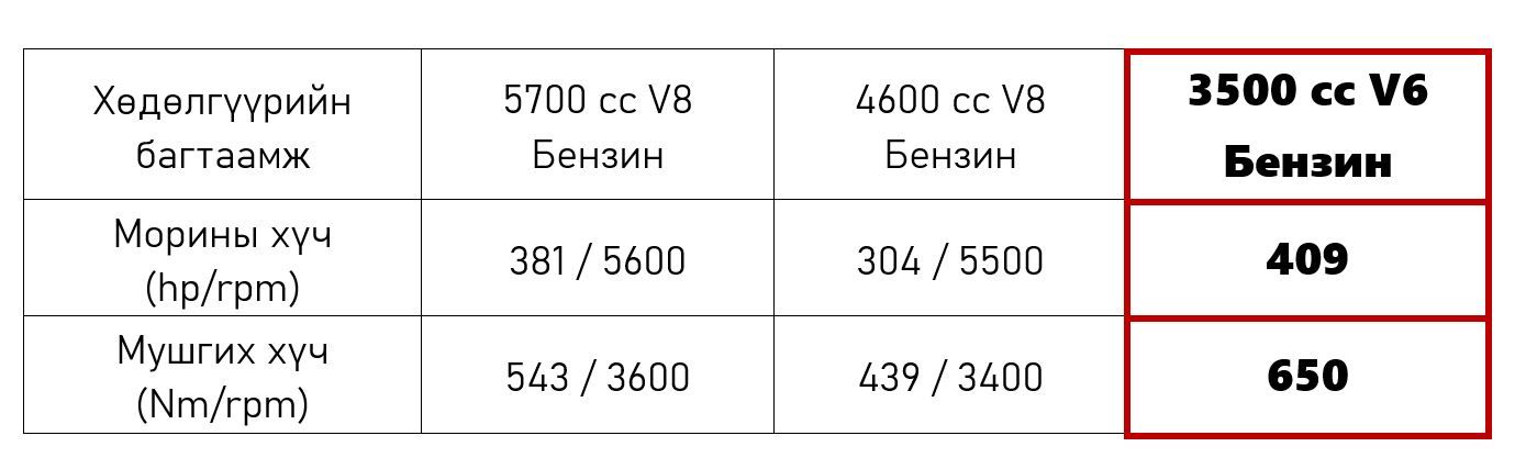 3,5 литрийн багтаамжтай хос турбо хөдөлгүүр, мөн 10 шатлалт автомат хурдны хайрцаг суурилуулсан бөгөөд хүчин чадал нэмэгдэж, шатахуун зарцуулалт болон хорт хий ялгаруулалт бууруулжээ.