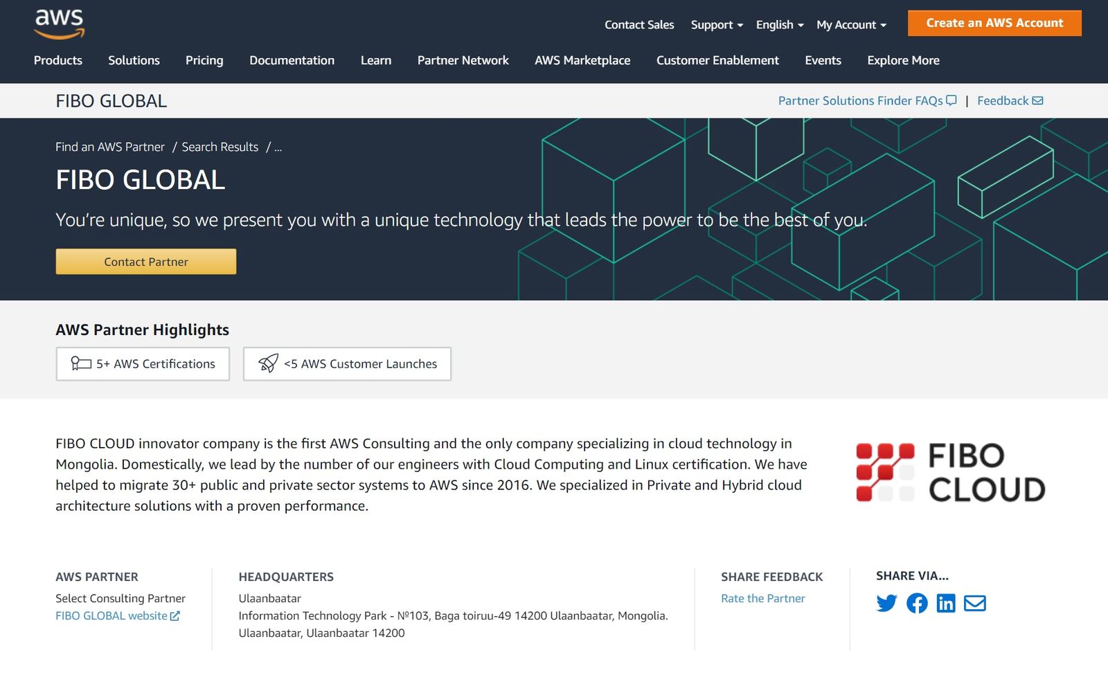 ФИБО КЛАУД компани нь 2017 оноос хойш 20+ байгууллагын бизнес платформыг AWS-рүү шилжүүлж, энэ хугацаанд нийт мэдээллийн технологид 684,000,000₮ сая төгрөгний дүнтэй зардлыг хэмнэжээ.
