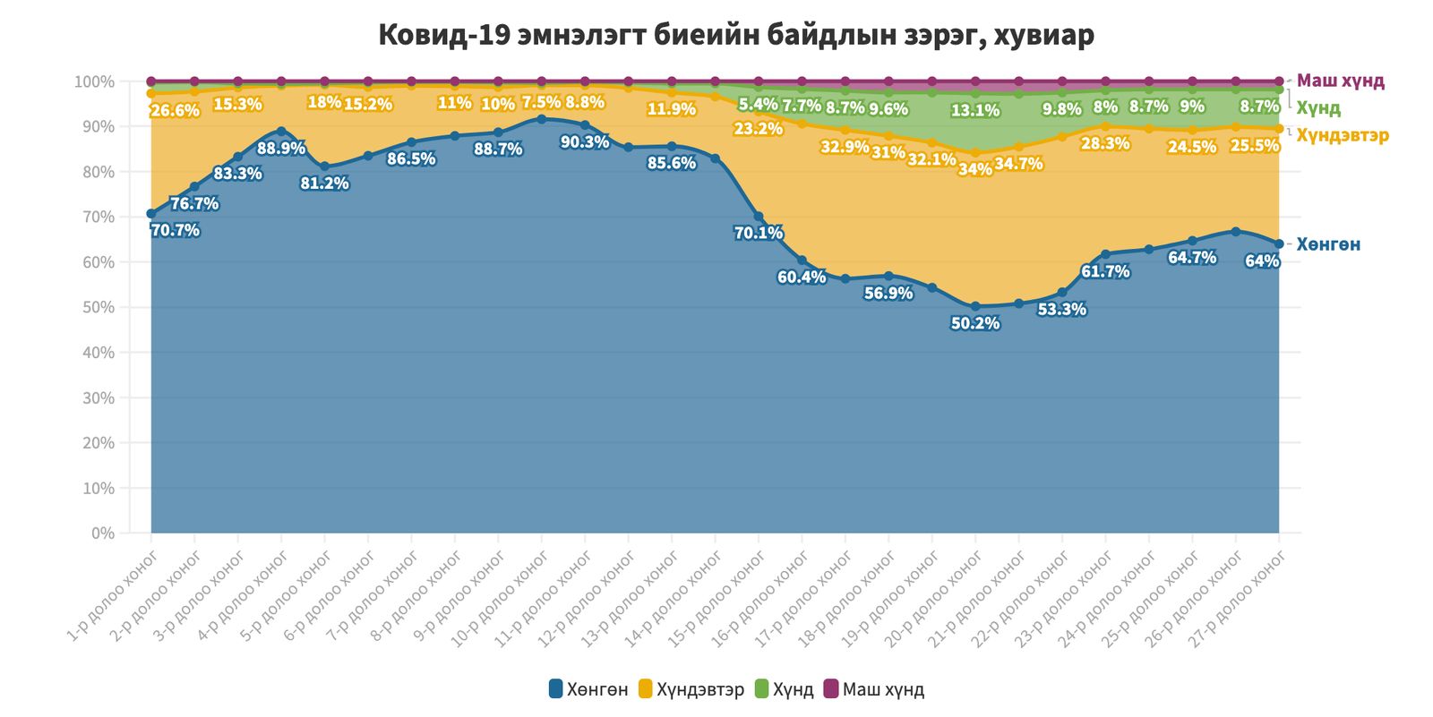 Манай улсад өнөөдрийн байдлаар 13,000 мянга орчим хүн КОВИД-19 халдварын улмаас эмнэлэгт эмчлүүлж байгаа. Тэдний 25 орчим хувь буюу дөрөвний нэг нь хүндэвтэр хэлбэрийн эмнэл зүйн оноштой буюу хүчилтөрөгч өтгөрүүлэгч аппаратын эмчилгээ шаардлагатай ангилалд багтаж байна.