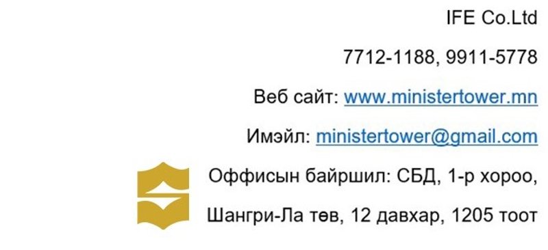 Улаанбаатар хотын төв цэгт, хотын хамгийн үнэ цэнэтэй бүсэд байрлах “Minister Tower” нь дэлхийн жишигт нийцэх худалдаа, үйлчилгээ, А зэрэглэлийн оффис, тансаг зэрэглэлийн апартмент, пентхаус бүхий орчин үеийн архитектур, интерьерийн шийдэлтэй цогцолбор барилга ба эрхэм танд тус төслийн онцлог, давуу талуудыг танилцуулж байна.