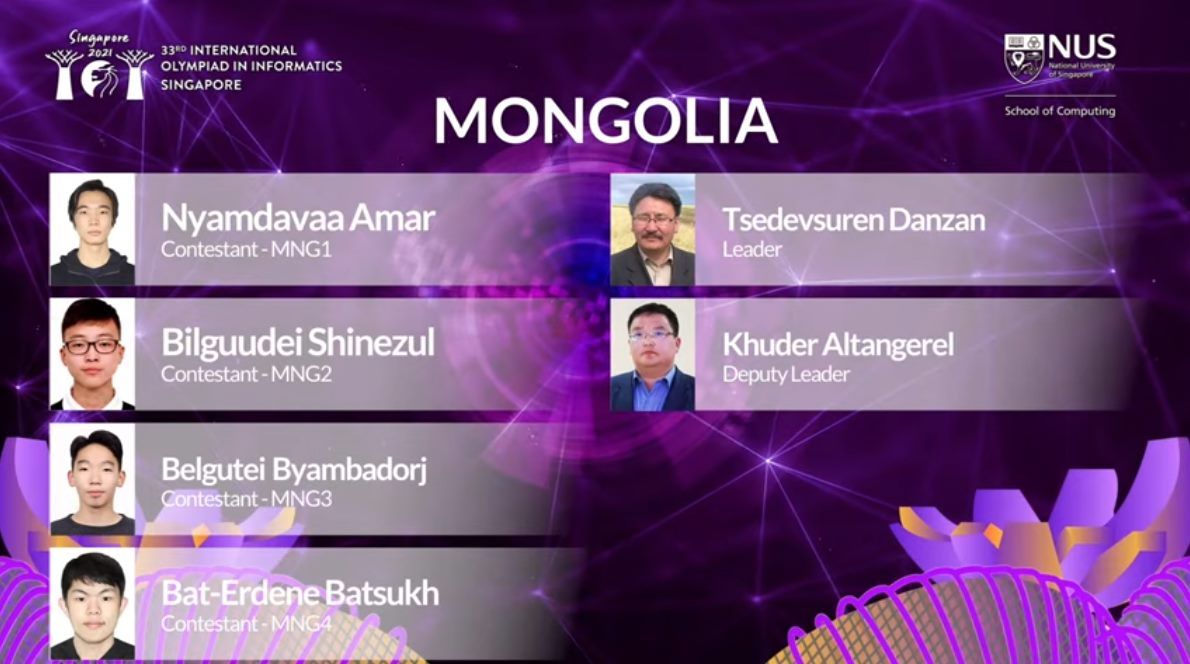 Олон улсын Мэдээлэл зүйн 33 дахь олимпиадыг Сингапур улс 2021 оны зургадугаар сарын 19-25-ны өдрүүдэд онлайнаар амжилттай зохион байгуулж дууслаа.